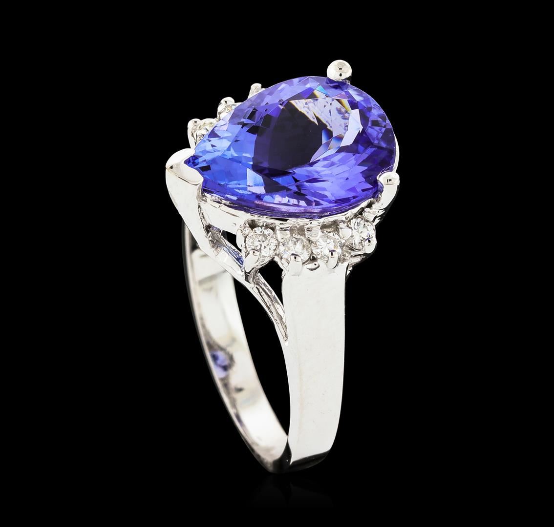 One electronically tested 14KT white gold lady's cast fashion ring with a cathedral shank with a bright polish finish. The featured lady's ring has diamond set shoulders and a shank measuring 2.55 millimeters wide. Identified with markings of '14K'. Condition is new, good workmanship. Containing: One prong set pear modified brilliant cut natural tanzanite, measuring 12.90 x 9.58 x 6.03mm, (depth est.) approximate weight of 4.56ct., clarity is eye clean, medium, moderately strong, bluish violet color, (GIA bV 5/4), cut is good. Transmitting light with no distortion, transparent. Colored gemstones are presumed to have been subjected to commonly used enhancement processes. Graded in the setting. Eight prong set round brilliant cut diamonds, measuring 2.00 - 1.90 x 1.21mm (depth est.) approximate total weight of 8 Stones = 0.23ct. Graded in the setting. Clarity SI-1 to I-1. Color: H - I Cut Good. Total Weight of Colored Stones 4.56ct.. Total Weight of Diamonds 0.23ct.. Total Weight of Ring 5.50gm. GAS Appraised at $8,155.00.