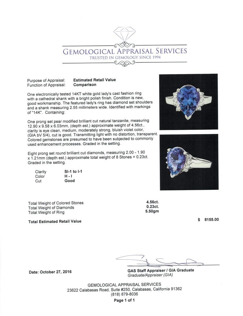 One electronically tested 14KT white gold lady's cast fashion ring with a cathedral shank with a bright polish finish. The featured lady's ring has diamond set shoulders and a shank measuring 2.55 millimeters wide. Identified with markings of '14K'. Condition is new, good workmanship. Containing: One prong set pear modified brilliant cut natural tanzanite, measuring 12.90 x 9.58 x 6.03mm, (depth est.) approximate weight of 4.56ct., clarity is eye clean, medium, moderately strong, bluish violet color, (GIA bV 5/4), cut is good. Transmitting light with no distortion, transparent. Colored gemstones are presumed to have been subjected to commonly used enhancement processes. Graded in the setting. Eight prong set round brilliant cut diamonds, measuring 2.00 - 1.90 x 1.21mm (depth est.) approximate total weight of 8 Stones = 0.23ct. Graded in the setting. Clarity SI-1 to I-1. Color: H - I Cut Good. Total Weight of Colored Stones 4.56ct.. Total Weight of Diamonds 0.23ct.. Total Weight of Ring 5.50gm.