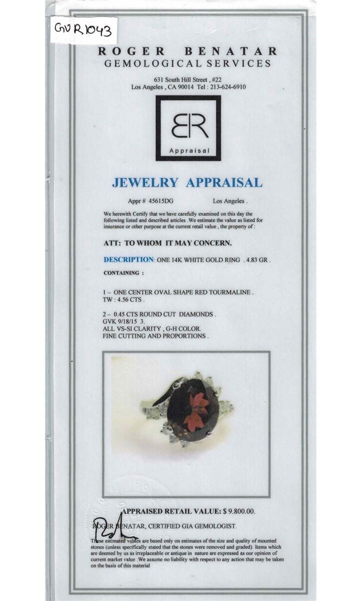 14K WHITE GOLD NATURAL TOURMALINE RING:4.83 GRAMS/DIAMOND:0.45CT/TOURMALINE:4.56CT/#GVR1043