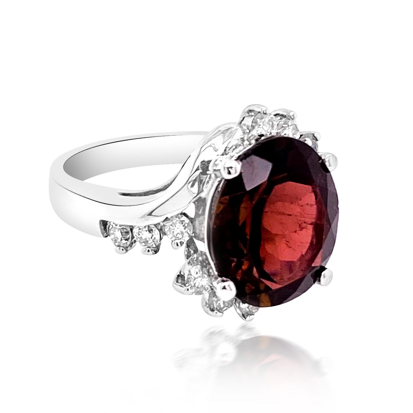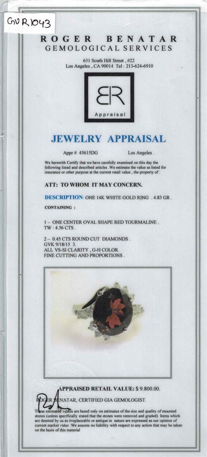 14K WHITE GOLD NATURAL TOURMALINE RING:4.83 GRAMS/DIAMOND:0.45CT/TOURMALINE:4.56CT/#GVR1043 **Rubellite makes an excellent gift for one's romantic partner because of its capacity to fan the flames of passion. Crafted in warm 14K white gold, this handsome style features a 4.56ct oval shape deep Red Tourmaline center stone. Shimmering 0.45ct round cut Diamond accents flank each side adding a touch of subtle sparkle, while nugget-textured detailing adorns the ring's stepped shank.**