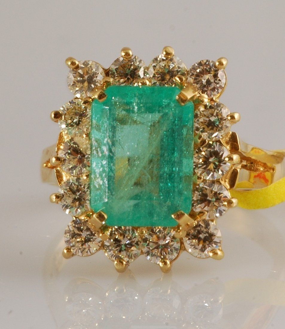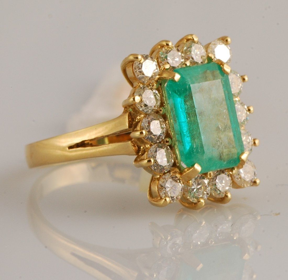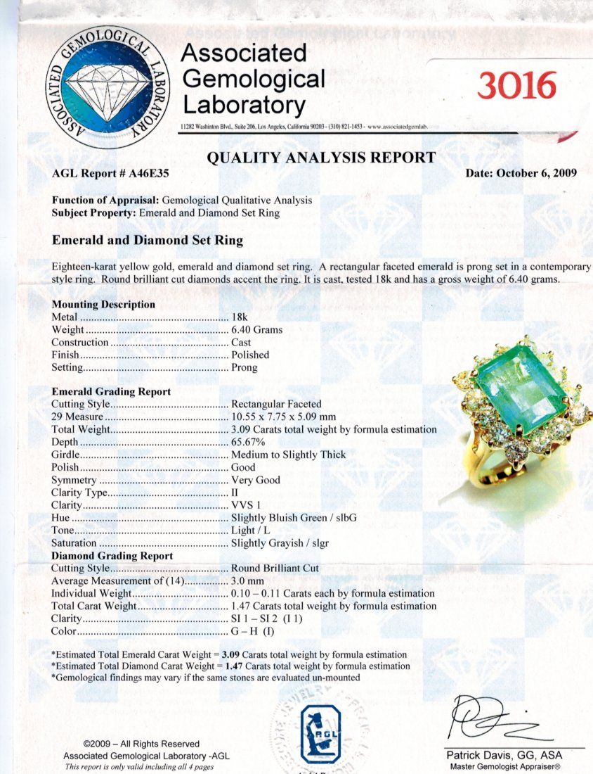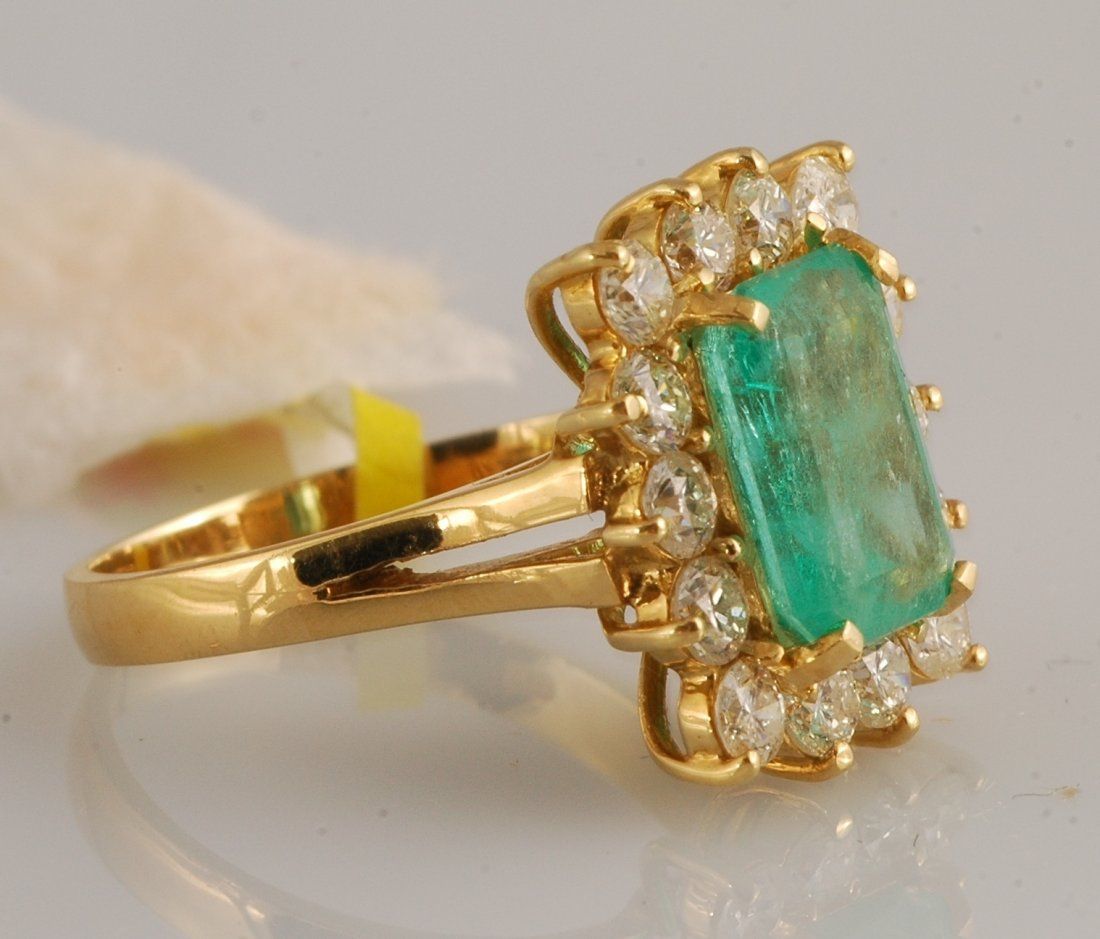 18K Yellow gold, Emerald (3.09 ct) and Diamond (1.47 ct) set Ring. A rectangular faceted Emerald is prong set in a contemporary style ring. Round brilliant cut diamonds accent the ring. It is cast, tested 18K and has a gross weight of 6.40 grams.