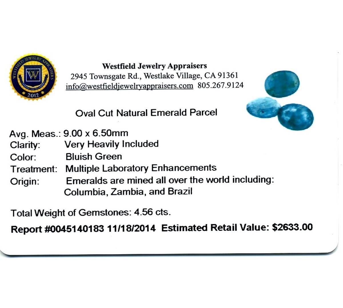 4.56cts. Oval Cut Natural Emerald Parcel Westfield Appraised at $2,633.00.