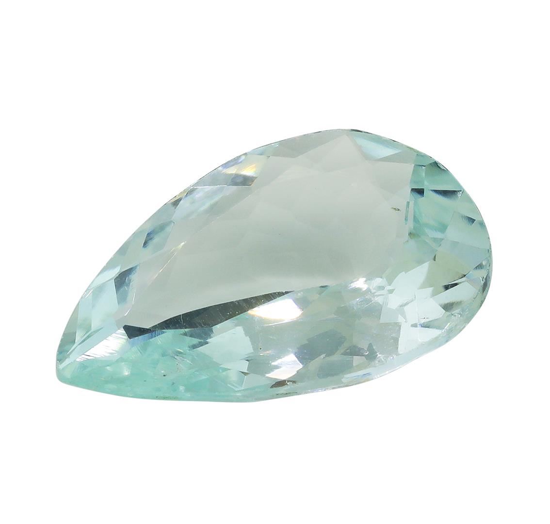One natural pear cut aquamarine with an exact weight of 4.57ct., clarity is eye clean, slightly grayish greenish blue, light. Gemological Appraisals Services estimates the retail value at $1302.45 GAS Appraised.