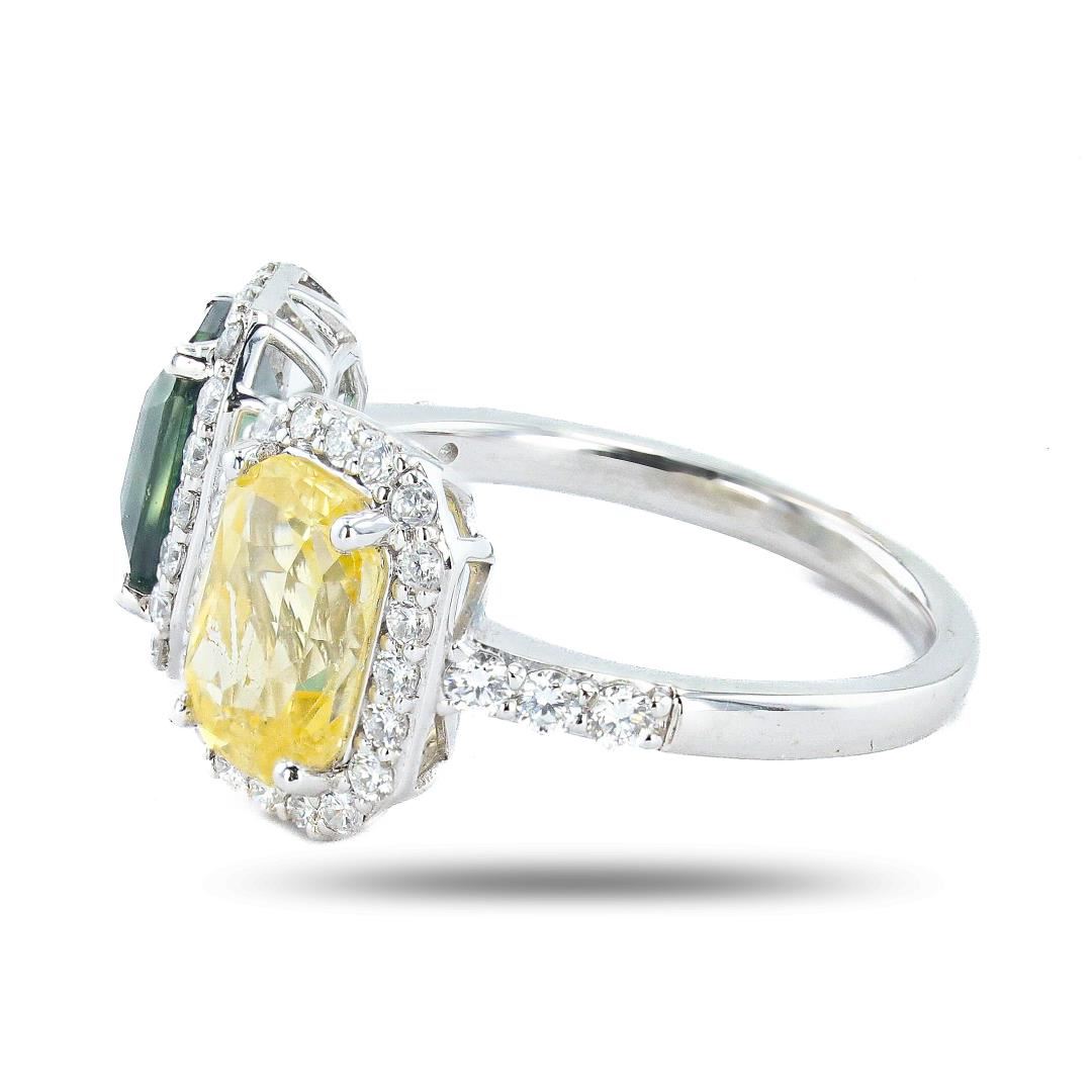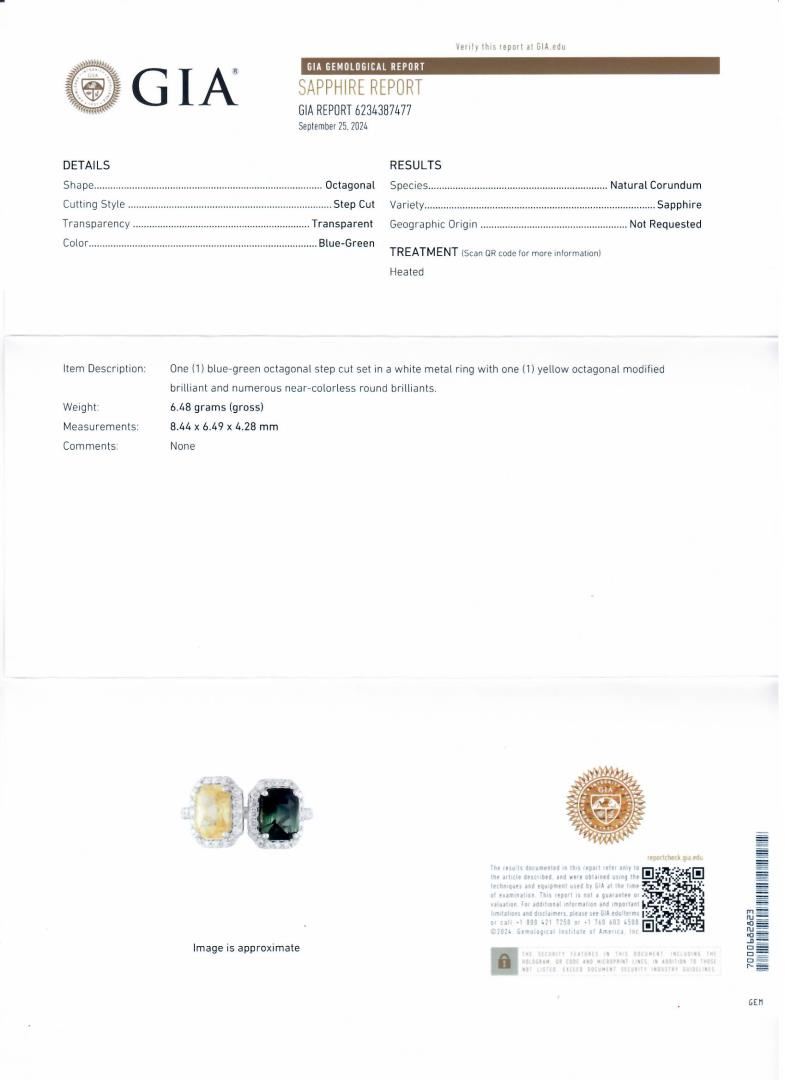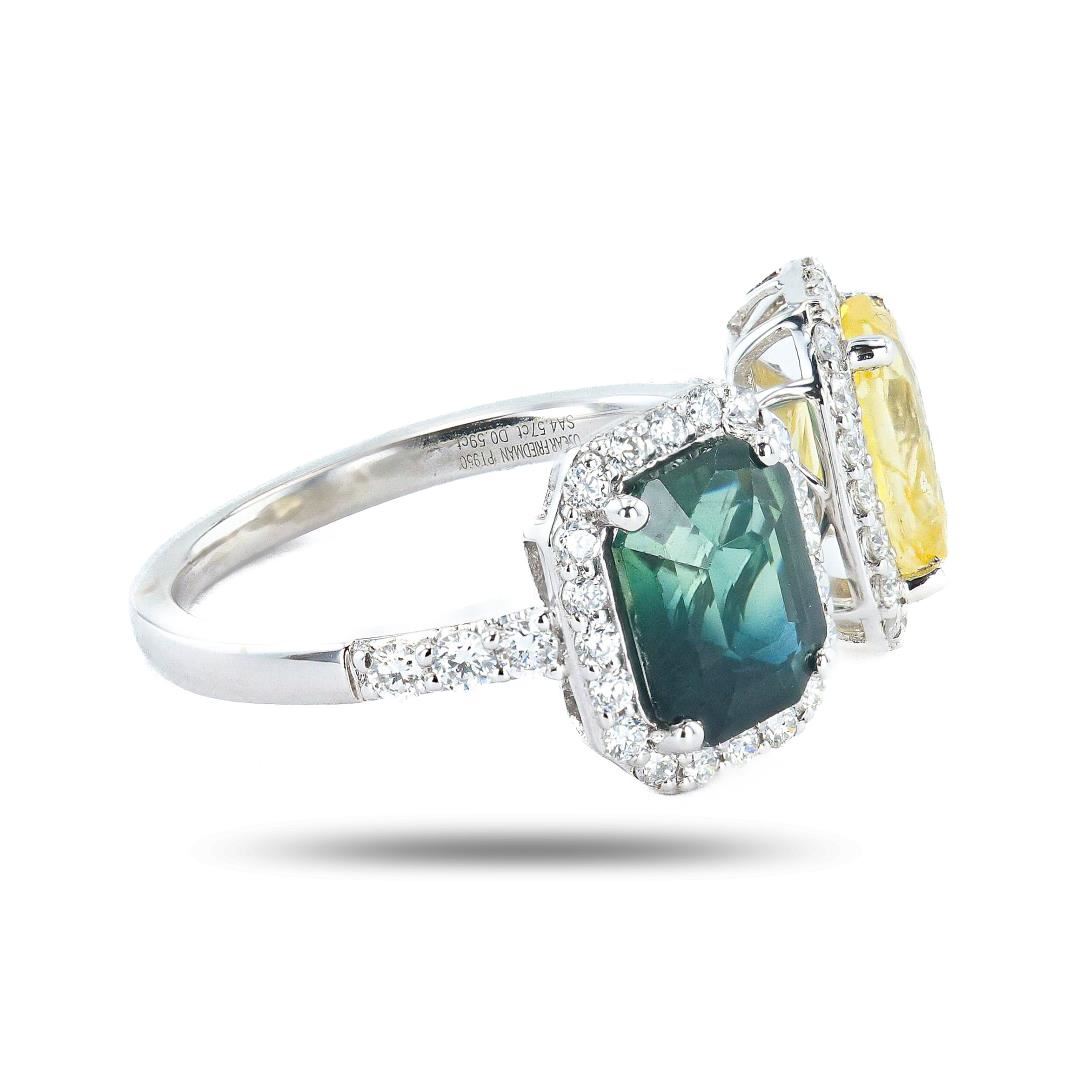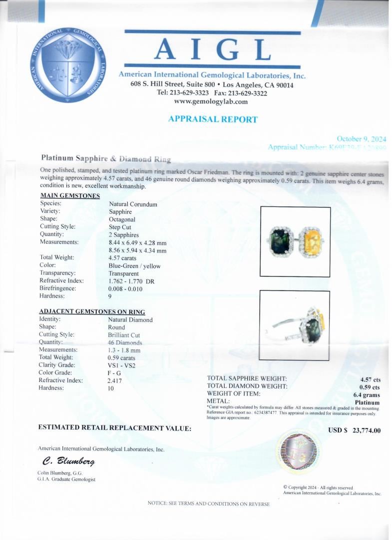 One polished, stamped, and tested platinum ring marked Oscar Friedman. The ring is mounted with: 2 genuine sapphire center stones weighing approximately 4.57 carats, and 46 genuine round diamonds weighing approximately 0.59 carats. This item weighs 6.4 grams, condition is new, excellent workmanship. #MAIN GEMSTONES# Species: Natural Corundum Variety: Sapphire Shape: Octagonal Cutting Style: Step Cut Quantity: 2 Sapphires Measurements: 8.44 x 6.49 x 4.28mm, 8.56 x 5.94 x 4.34mm Total Weight: 4.57 carats Color: Blue-Green / Yellow Transparency: Transparent Refractive Index: 1.762 - 1.770 DR Birefringence: 0.008 - 0.010 Hardness: 9 #ADJACENT GEMSTONES ON RING# Identity: Natural Diamond Shape: Round Cutting Style: Brilliant Cut Quantity: 46 Diamonds Measurements: 1.3 - 1.8mm Total Weight: 0.59 carats Clarity Grade: VSI-VS2 Color Grade: F-G Refractive Index: 2.417 Hardness: 10 TOTAL SAPPHIRE WEIGHT: 4.57 cts TOTAL DIAMOND WEIGHT: 0.59 cts WEIGHT OF ITEM: 6.4 grams METAL: Platinum Size: 7 1/4