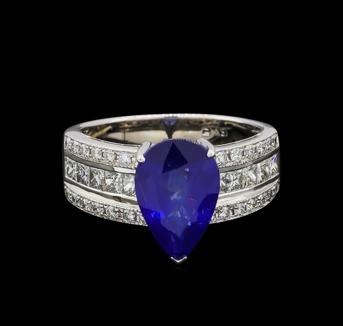 One electronically tested 18KT white gold lady's combination cast & assembled fashion ring with a three row cathedral halo with a bright polish with milgrain detailing finish. The featured lady's ring has a shank measuring 3.76 millimeters in width. Identified with markings of "18K". Condition is new, good workmanship. Containing: One prong set pear modified brilliant cut natural blue sapphire, measuring 12.40 x 8.23 x 5.50mm, (depth est.) approximate weight of 4.57ct., clarity is slightly included, medium, moderately strong, violetish blue color, (GIA vB 5/4), cut is very good. Transmitting light with a minimum of distortion, transparent. Colored gemstones are presumed to have been subjected to commonly used enhancement processes. Graded in the setting. Ten channel set princess cut diamonds, measuring 2.30 x 2.25 x 1.69mm (depth est.) approximate total weight of 10 Stones = 0.71ct. Graded in the setting. Clarity: VS-1 to VS-2. Color: H - I. Cut Very Good Twenty-Eight prong set round brilliant cut diamonds, measuring 1.40 - 1.30 x 0.84mm (depth est.) approximate total weight of 28 Stones = 0.28ct. Graded in the setting. Clarity: VS-2 to SI-1. Color: G - Good. Total Weight of Colored Stones 4.57ct. Total Weight of Diamonds 0.99ct. Total Weight of Ring 7.50gm. GAS Appraised at $25,945.00.