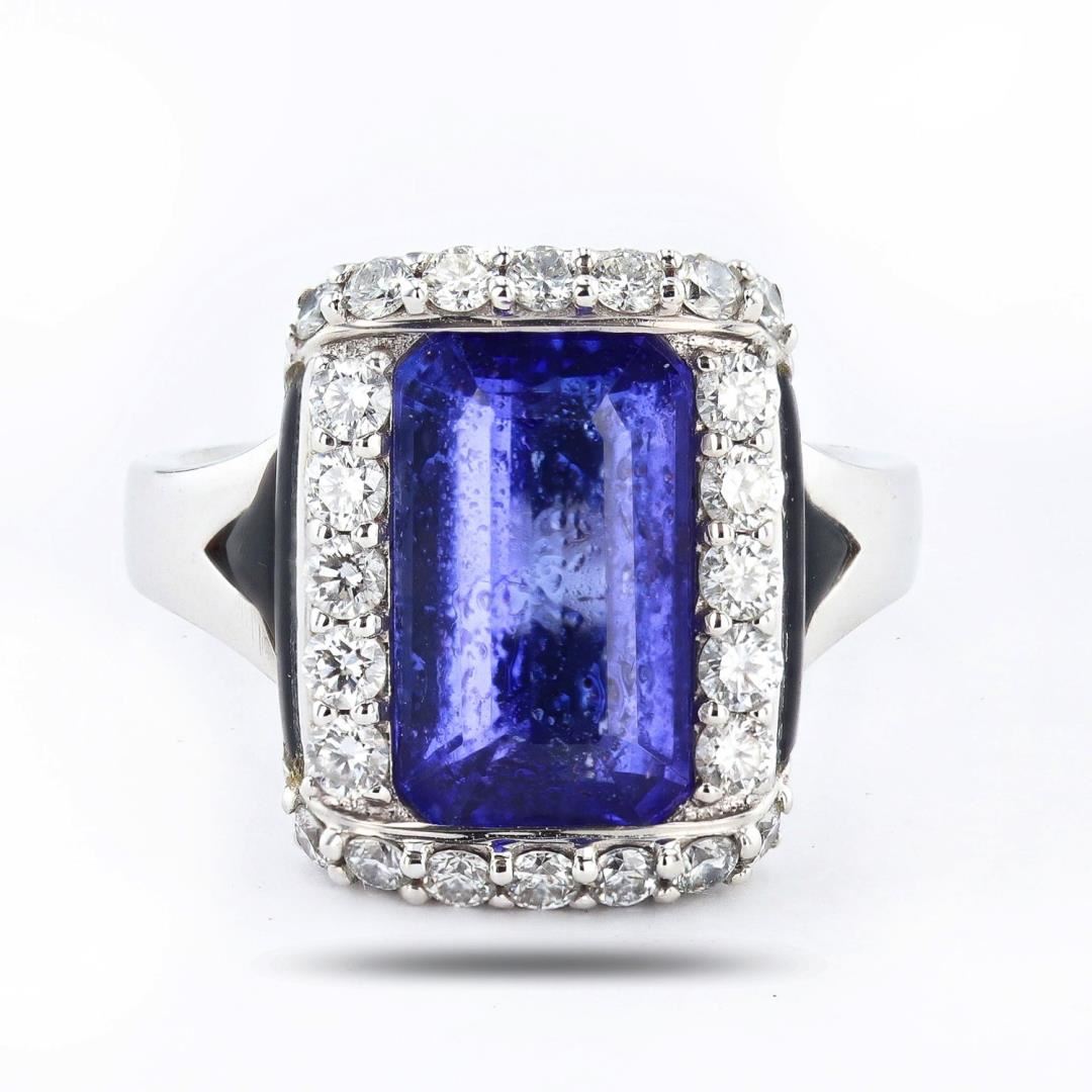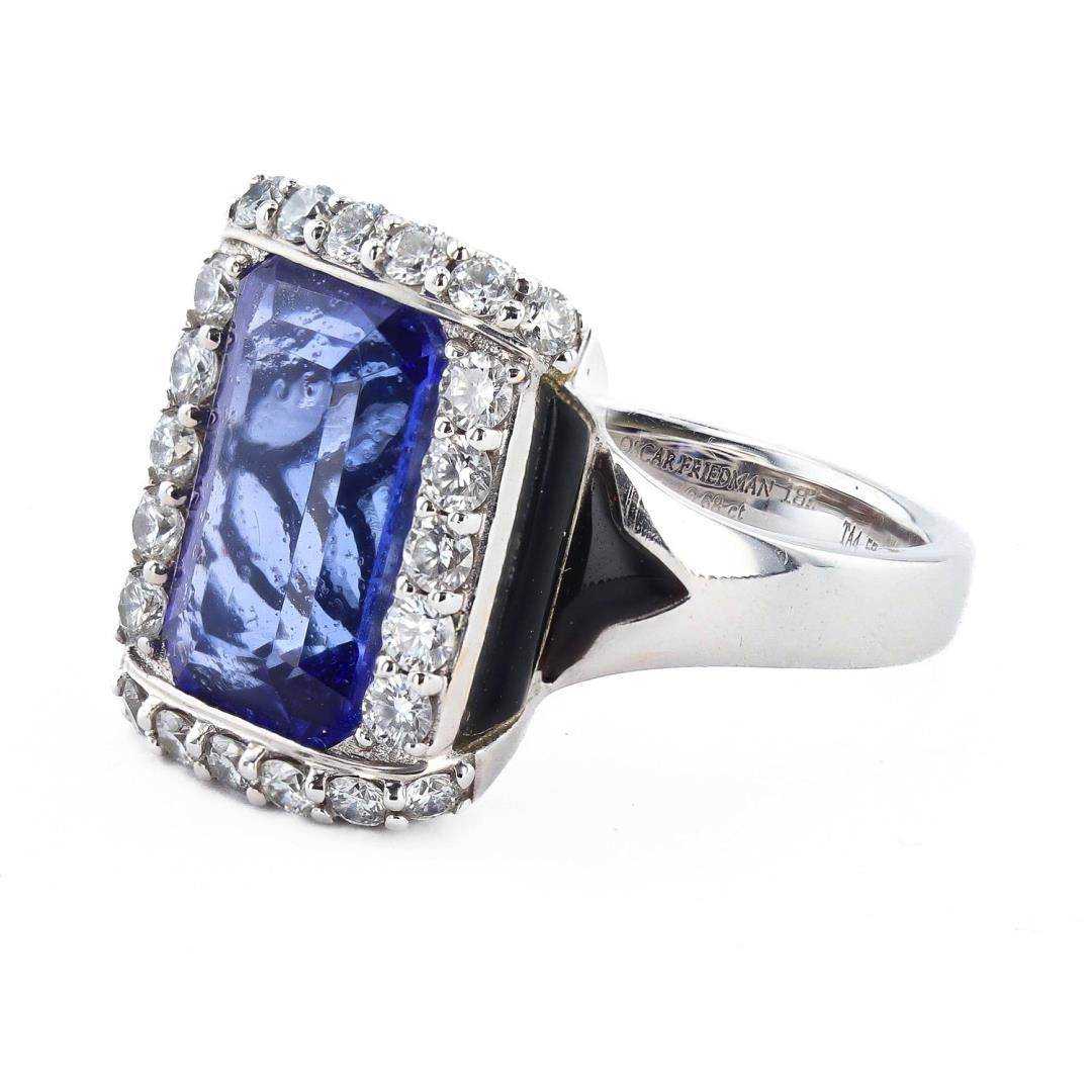 One electronically tested 18KT white gold cast tanzanite, onyx & diamond ring. Featuring a tanzanite set within a curved diamond bezel, supported by onyx inlay shoulders, a ribbed and lattice under gallery, completed by a three millimeter wide band. Bright polish finish. Trademark is Oscar Friedman. Identified with markings of "18K". Condition is new, good workmanship. One bezel set octagonal standard step cut natural tanzanite, measuring 12.50 x 7.60 x 5.00mm, approximate weight of 4.57ct., clarity is slightly included, type I, medium dark, moderately strong, blue color, (GIA B 6/4), cut is very good. Transmitting light with no distortion, transparent. Graded in the setting. Tanzanite is a very rare gemstone that is only found in Tanzania. The mining area is located just south of the Kenya border near Mt. Kilimanjaro. Tanzanite occurs in colors of gray, brown, violet, blue, reddish-purple, & green. Rotated in different directions tanzanite will exhibit multiple changes of color. Tanzanite has a low tolerance to ultrasonic cleaning and should not be cleaned using this method. Twenty-four prong set round brilliant cut diamonds, measuring 2.20 - 1.90 x 1.23mm approximate total weight of 24 Stones = 0.77ct. The clarity & color grade reflect the overall average for the group. Graded in the setting. Clarity: VS-1 to SI-1 Color: E-G Total Weight of Colored Stones: 4.57ct. Total Weight of Diamonds: 0.77ct. Total Weight of Ring: 9.00 gm Size: 6 3/4