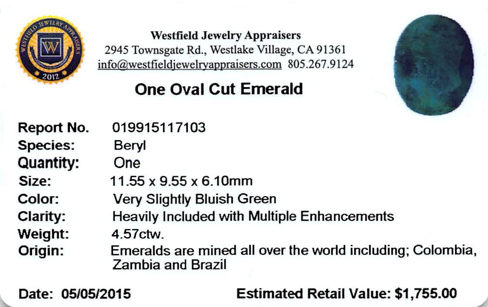 One oval mixed cut natural emerald, measuring 11.55 x 9.55 x 6.10mm, exact weight 4.57ct., clarity is heavily included, type III, medium dark, very slightly grayish, very slightly bluish green color, (GIA vslbG 6/3) Indications of multiple laboratory enhancements, including high temperature heat treatment. Westfield Appraised at $1,755.00.