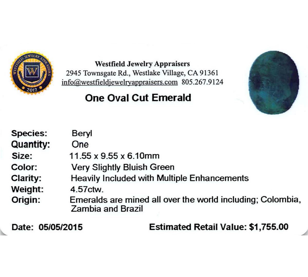 One oval mixed cut natural emerald, measuring 11.55 x 9.55 x 6.10mm, exact weight 4.57ct., clarity is heavily included, type III, medium dark, very slightly grayish, very slightly bluish green color, (GIA vslbG 6/3) Indications of multiple laboratory enhancements, including high temperature heat treatment. Westfield Appraised at $1,755.00.