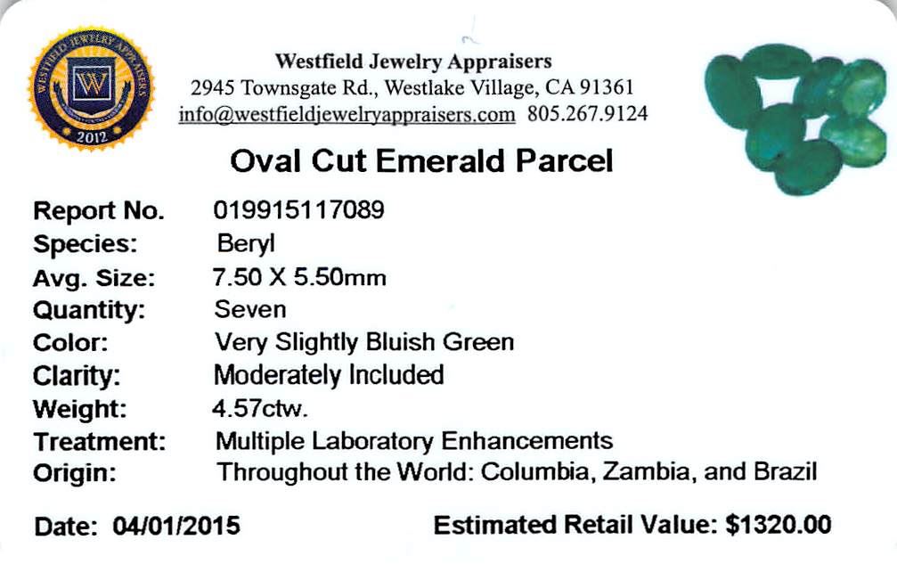 Six oval mixed cut natural emeralds exact total weight 4.57ct., clarity is moderately included, type III, medium dark, very slightly grayish, very slightly bluish green color, (GIA vslbG 6/3), cut is good. Westfield Appraised at $1,320.00.