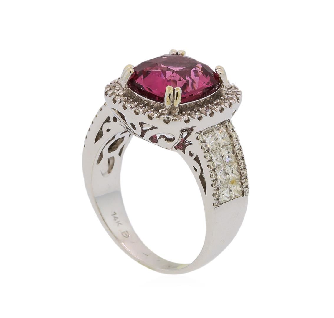 One electronically tested 14KT white gold lady's cast fashion ring with a cathedral shank with a basket halo with a bright polish finish. The featured lady's ring has a shank measuring 2.74 millimeters wide. Identified with markings of '14K'. Condition is new, good workmanship. Containing: One prong set rectangular cushion modified brilliant cut natural red spinel, measuring 10.15 x 8.96 x 5.80mm, (depth est.) approximate weight of 4.58ct., clarity is eye clean, medium, moderately strong, orangy red color, (GIA oR 5/4), cut is good. Transmitting light with no distortion, transparent. Colored gemstones are presumed to have been subjected to commonly used enhancement processes. Graded in the setting. Twenty-Two prong set round brilliant cut diamonds, measuring 1.40 - 1.35 x 0.86mm (depth est.) approximate total weight of 22 Stones = 0.22ct. Graded in the setting. Clarity SI-1 to SI-2. Color: G - H Cut Good Thirty-Two prong set round brilliant cut diamonds, measuring 1.10 - 1.00 x 0.65mm (depth est.) approximate total weight of 32 Stones = 0.14ct. Graded in the setting. Clarity VS-2 to SI-1. Color: G - I Cut Good Sixteen invisible set princess cut diamonds, measuring 2.10 x 2.00 x 1.50mm (depth est.) approximate total weight of 16 Stones = 0.83ct. Graded in the setting. Clarity VS-2 to SI-1. Color: H - I Cut Good. Total Weight of Colored Stones 4.58ct.. Total Weight of Diamonds 1.19ct.. Total Weight of Ring 7.70gm. GAS Appraised at $20,600.00.