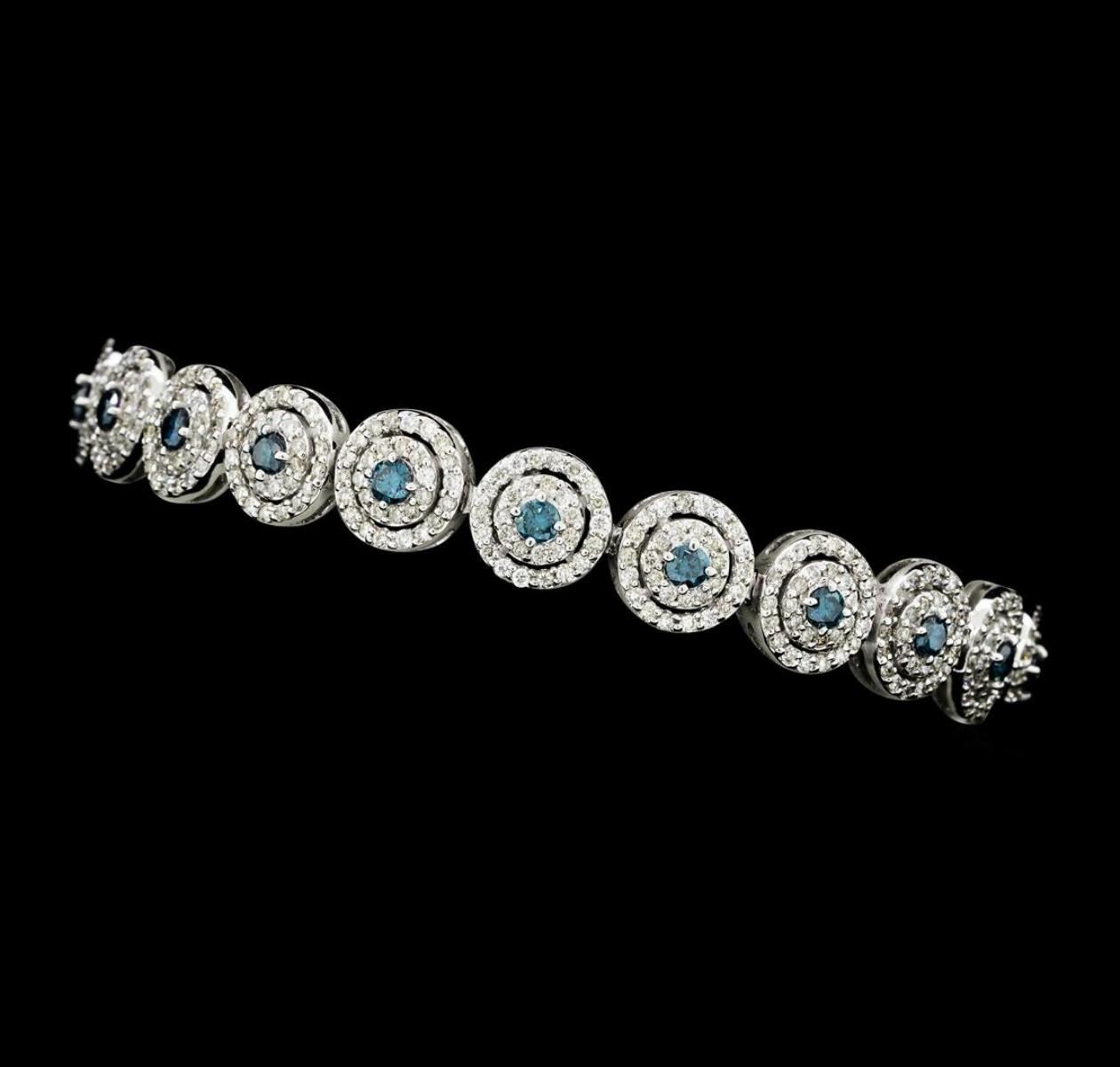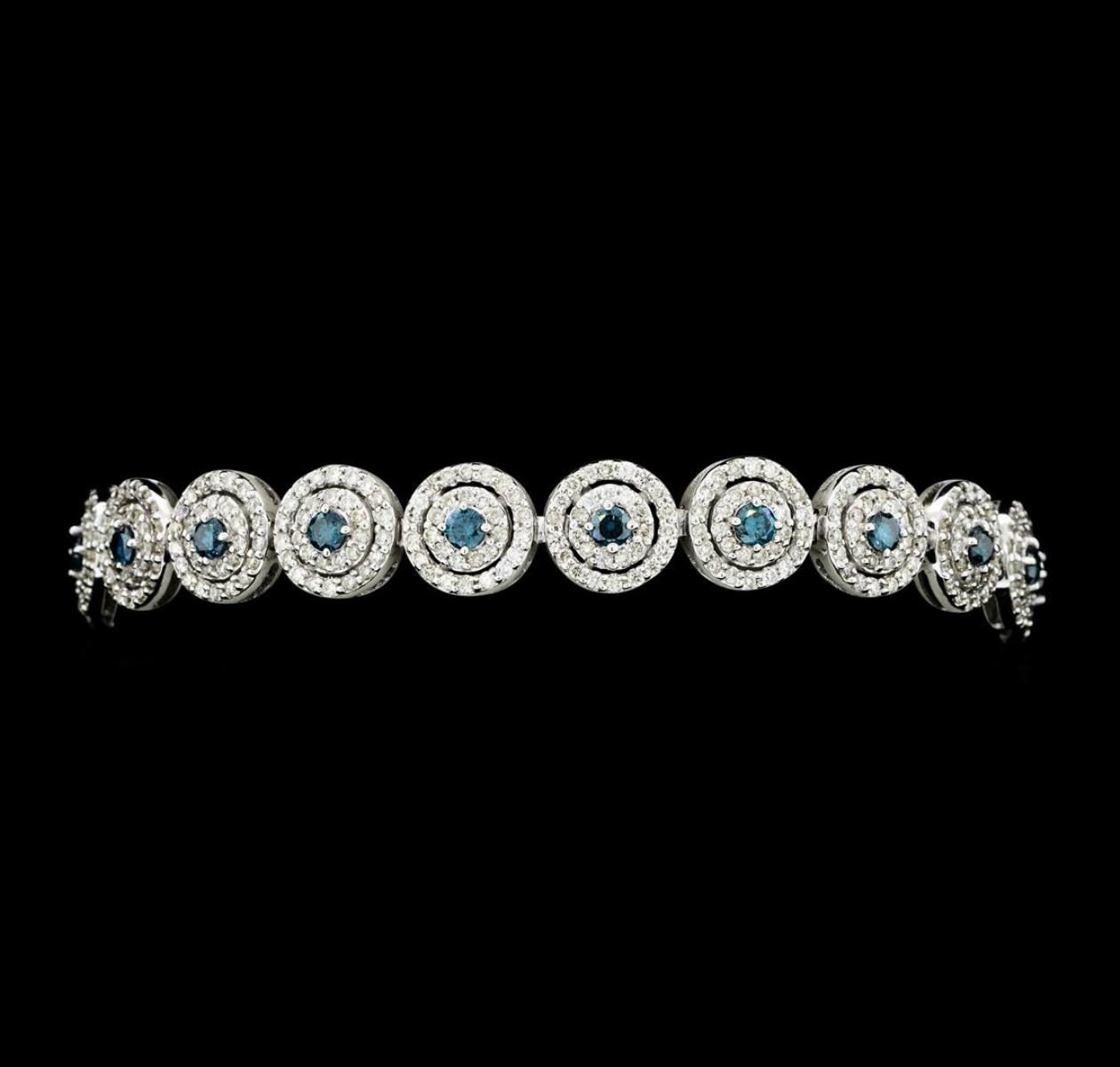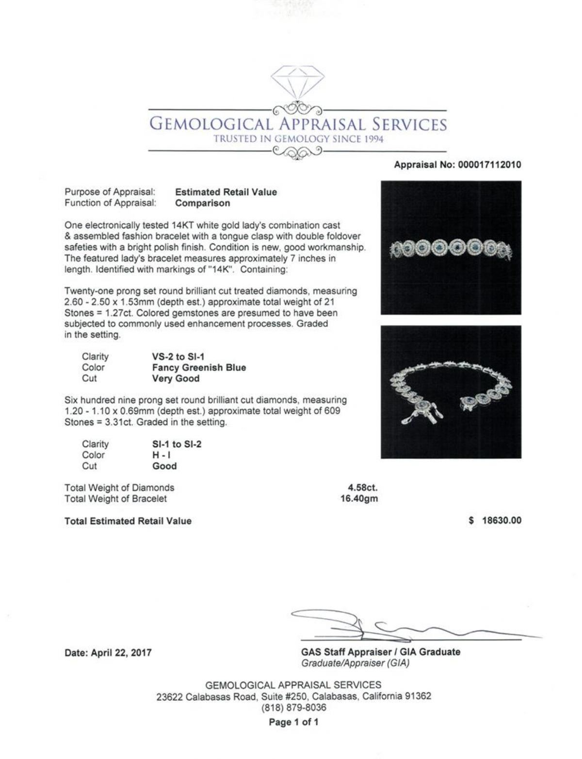One electronically tested 14KT white gold lady's combination cast & assembled fashion bracelet with a tongue clasp with double foldover safeties with a bright polish finish. The featured lady's bracelet measures approximately 7 inches in length. Identified with markings of '14K'. Condition is new, good workmanship. Containing: Twenty-One prong set round brilliant cut treated diamonds, measuring 2.60 - 2.50 x 1.53mm (depth est.) approximate total weight of 21 Stones = 1.27ct. Colored gemstones are presumed to have been subjected to commonly used enhancement processes. Graded in the setting. Color Fancy Greenish Blue Clarity VS-2 to SI-1 Cut Very Good Six Hundred Nine prong set round brilliant cut diamonds, measuring 1.20 - 1.10 x 0.69mm (depth est.) approximate total weight of 609 Stones = 3.31ct. Graded in the setting. Color H - I Clarity SI-1 to SI-2 Cut Good. Total Weight of Diamonds 4.58ct.. Total Weight of Bracelet 16.40gm GAS Appraised at $18630.00. GAS Appraised.