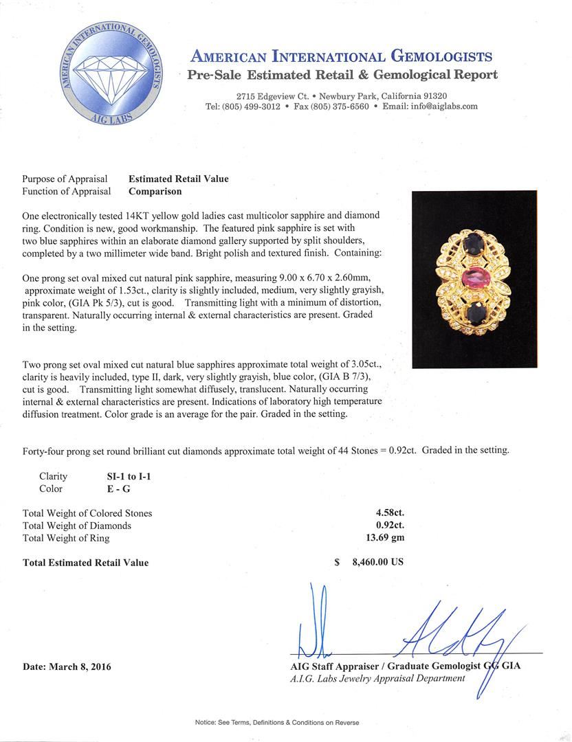 One electronically tested 14KT yellow gold ladies cast multicolor sapphire and diamond ring. The featured pink sapphire is set with two blue sapphires within an elaborate diamond gallery supported by split shoulders, completed by a two millimeter wide band. Bright polish and textured finish. Condition is new, good workmanship. Containing: One prong set oval mixed cut natural pink sapphire, measuring 9.00 x 6.70 x 2.60mm, approximate weight of 1.53ct., clarity is slightly included, medium, very slightly grayish, pink color, (GIA Pk 5/3), cut is good. Transmitting light with a minimum of distortion, transparent. Naturally occurring internal & external characteristics are present. Graded in the setting. Two prong set oval mixed cut natural blue sapphires approximate total weight of 3.05ct., clarity is heavily included, type II, dark, very slightly grayish, blue color, (GIA B 7/3), cut is good. Transmitting light somewhat diffusely, translucent. Naturally occurring internal & external characteristics are present. Indications of laboratory high temperature diffusion treatment. Color grade is an average for the pair. Graded in the setting. Forty-Four prong set round brilliant cut diamonds approximate total weight of 44 Stones = 0.92ct. Graded in the setting. Clarity: SI-1 to I-1. Color: E - G. Total Weight of Colored Stones 4.58ct. Total Weight of Diamonds 0.92ct. Total Weight of Ring 13.69gm. AIG Appraised at $8,460.00.