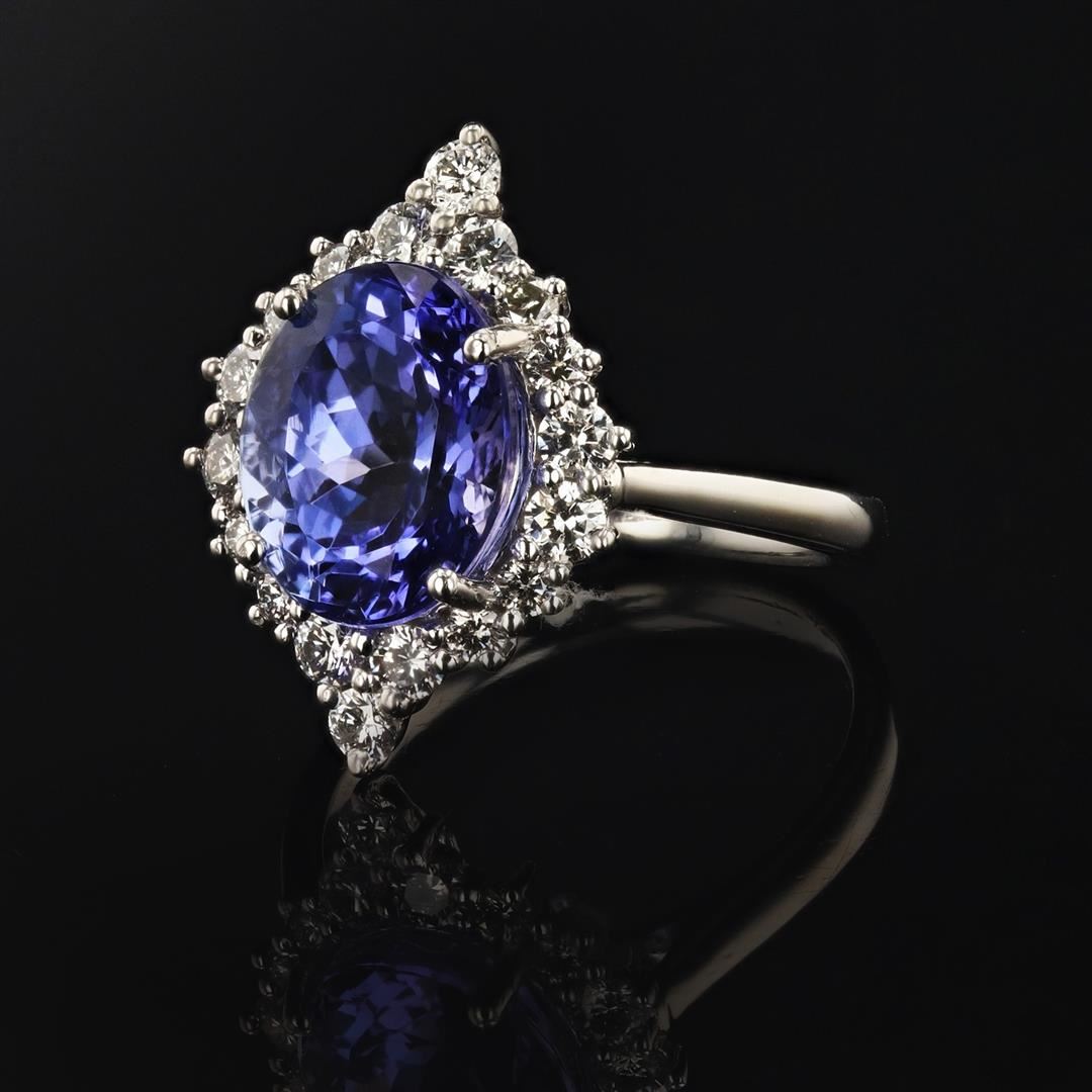 4.58ct Tanzanite and 0.74ctw Diamond Ring. Please see Photos and Description for all available information. This beautiful ring features a stunning 4.58ct Tanzanite gemstone and a 0.74ct round cut diamond center gemstone. The unique and contemporary design of this ring symbolizes an unending memory of love as the diamonds are entwined with a solid platinum band. The ring is size 7