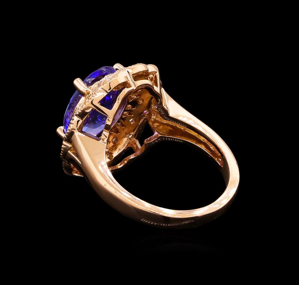 One electronically tested 14KT rose gold lady's cast fashion ring with a scalloped basket halo with a bright polish with milgrain detailing finish. The featured lady's ring has a shank measuring 2.50 millimeters wide. Identified with markings of "14K". Condition is new, good workmanship. Containing: One prong set oval modified brilliant cut natural tanzanite, measuring 12.60 x 9.80 x 5.25mm, approximate weight of 4.58ct., clarity is eye clean, type I, medium, moderately strong, violetish blue color, (GIA vB 5/4), cut is very good. Transmitting light with no distortion, transparent. Colored gemstones are presumed to have been subjected to commonly used enhancement processes. Graded in the setting. Twenty-Four prong set round brilliant cut diamonds, measuring 1.40 - 1.35 x 0.86mm (depth est.) approximate total weight of 24 Stones = 0.24ct. Graded in the setting. Clarity: SI-2 to I-1. Color: H - I. Cut Good. Total Weight of Colored Stones 4.58ct. Total Weight of Diamonds 0.24ct. Total Weight of Ring 8.10gm. GAS Appraised at $9,175.00.