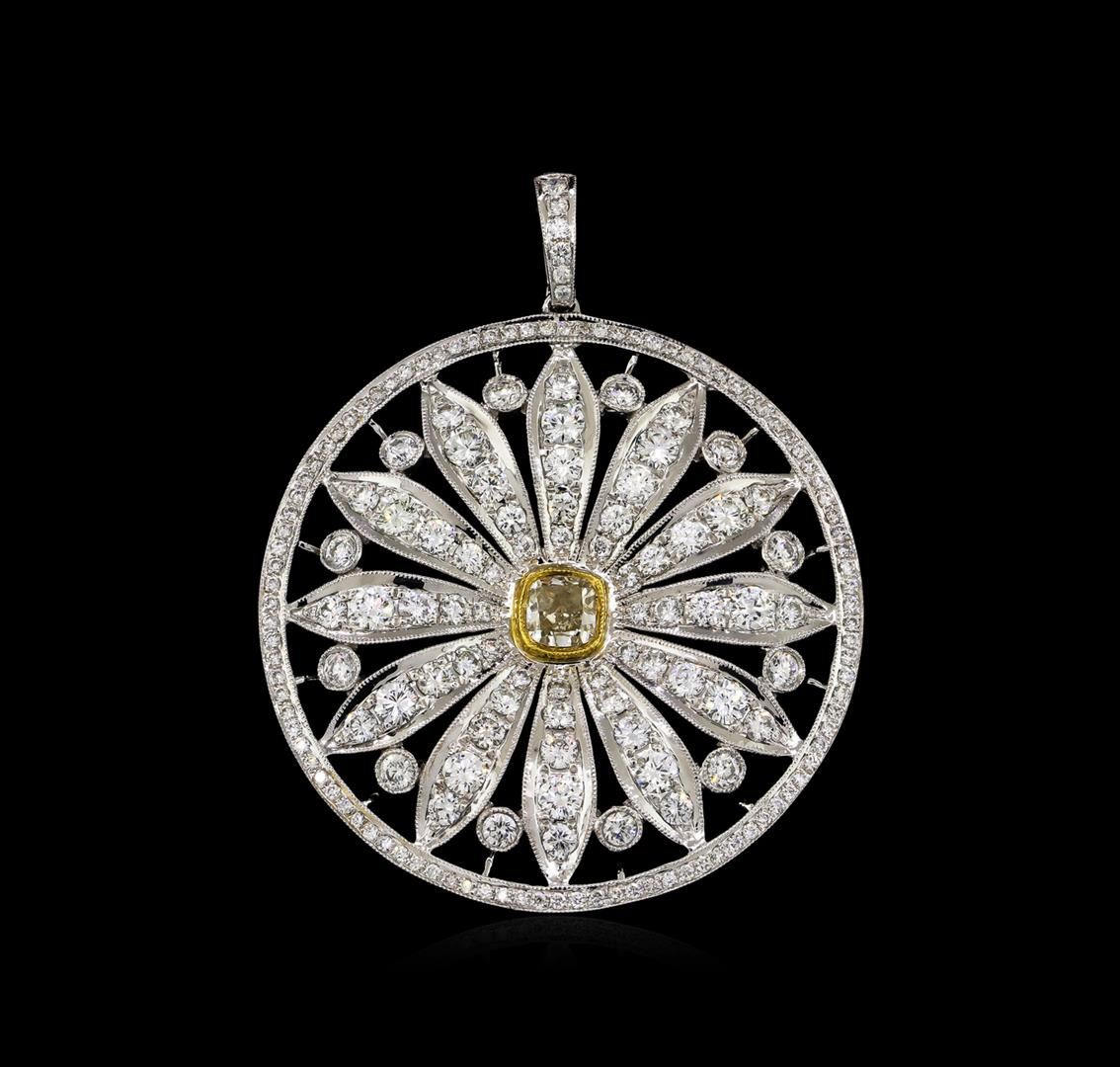 One electronically tested 18KT white gold ladies cast & assembled diamond pendant. The featured diamond is set within a diamond daisy encompassed by a forty millimeter wide diamond bezel disc, completed by a diamond set bail with safety. Bright polish finish with yellow gold accents and milgrain detailing. Trademark is MICHA. Identified with markings of "18K 750". Condition is new, good workmanship. Containing: One prong set cushion cut diamond, measuring 4.80 x 4.60 x 2.85mm (depth est.) approximate total weight of 0.64ct. Faint brown secondary color throughout. Graded in the setting. Clarity: VS-1 Sixty prong & bezel set round brilliant cut diamonds approximate total weight of 60 Stones = 3.24ct. Graded in the setting. Clarity: SI-1 to I-1. Color: G - I One Hundred Sixteen prong set round brilliant cut diamonds approximate total weight of 116 Stones = 0.71ct. The clarity grade reflects the entire range of clarity for this group. Graded in the setting. Clarity: SI-1 to I-2. Color: G - I. Total Weight of Diamonds 4.59ct. Total Weight of Pendant 14.72gm. AIG Appraised at $14,025.00.