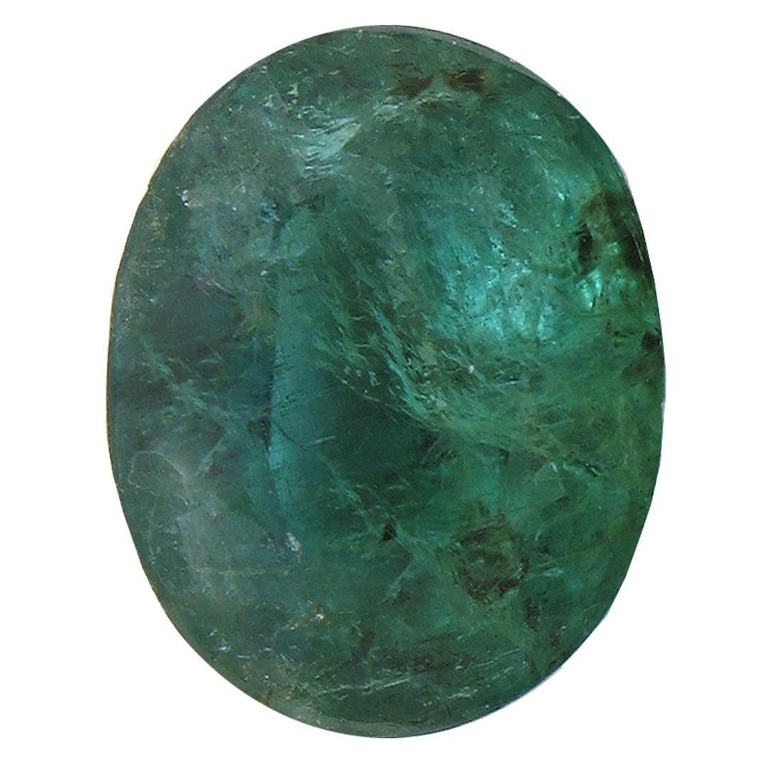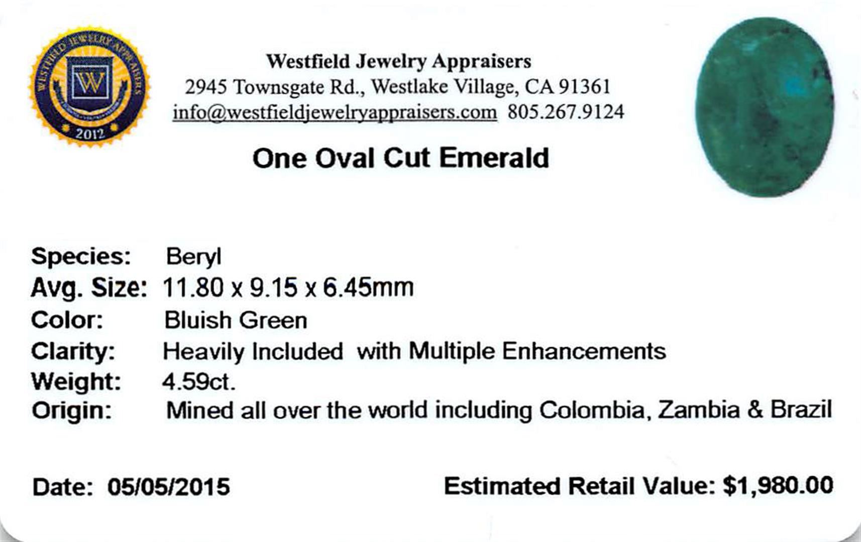 One oval mixed cut natural emerald, measuring 11.80 x 9.15 x 6.45mm, exact weight 4.59ct., clarity is heavily included, type III, dark, very slightly grayish, bluish green color, (GIA bG 7/3), cut is good. Indications of multiple laboratory enhancements, including high temperature heat treatment. Westfield Appraised at $1,980.00.