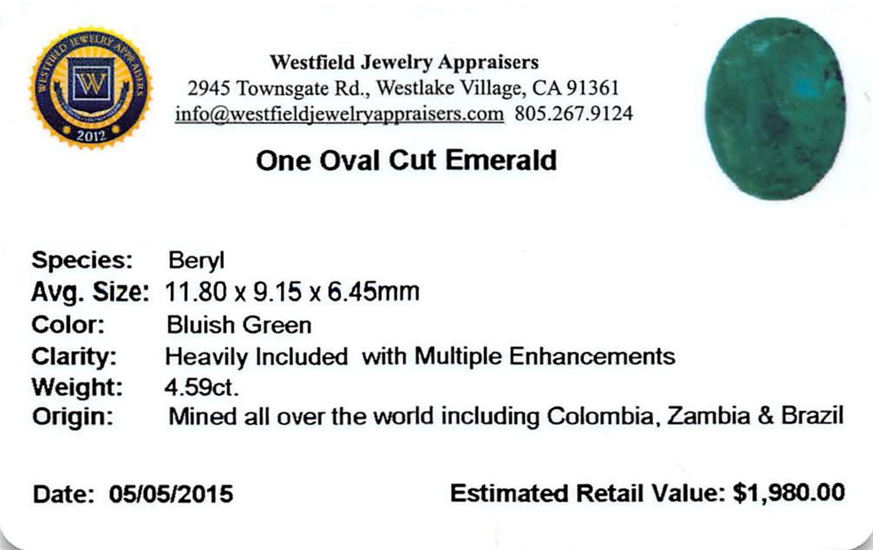 One oval mixed cut natural emerald, measuring 11.80 x 9.15 x 6.45mm, exact weight 4.59ct., clarity is heavily included, type III, dark, very slightly grayish, bluish green color, (GIA bG 7/3), cut is good. Indications of multiple laboratory enhancements, including high temperature heat treatment.