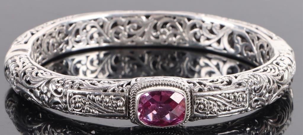 ~4.5ct cushion-cut pink sapphire Sarda designer sterling silver bangle bracelet.