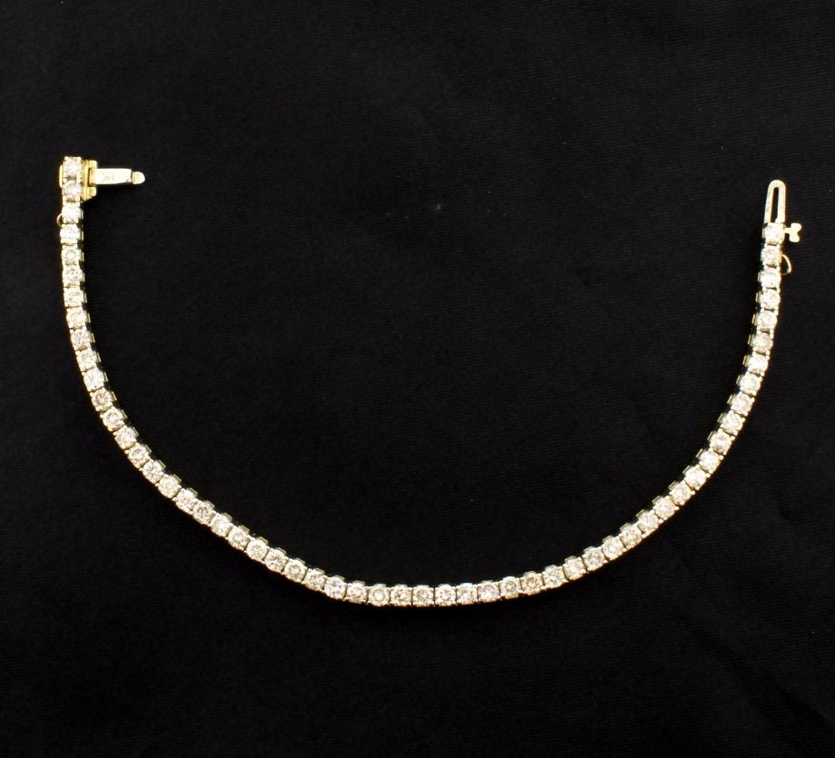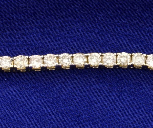 In 14K yellow gold, the bracelet contains fifty six high quality .08ct diamonds, SI clarity/I color. It is 7 inches long. 11.6g