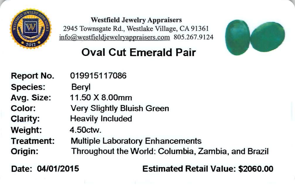 Two oval cut natural emeralds, measuring 11.75 x 8.00 x 3.18mm, exact total weight 4.50ct., clarity is heavily included, type III, medium dark, very slightly grayish, very slightly bluish green color, (GIA vslbG 6/3), cut is good. Indications of multiple laboratory enhancements, including high temperature heat treatment. Westfield Appraised at $2,060.00.