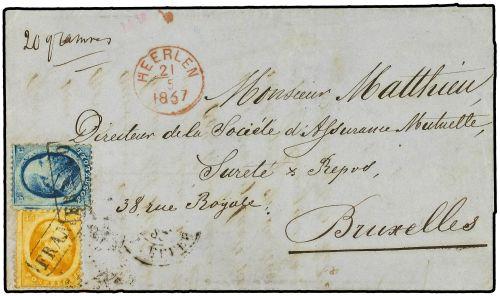 4,6 1867 HEERLEN a BRUSELAS. 5 cts. azul y 15 cts. amarillo. Rara combinación de franqueo.