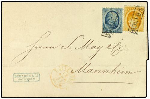 4,6 1867 ROTTERDAM a ALEMANIA. 5 cts. azul y 15 cts. amarillo.