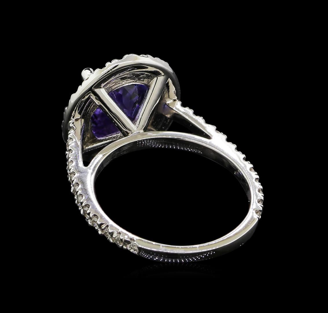 One electronically tested 14KT white gold lady's cast fashion ring with a halo with a bright polish finish. The featured lady's ring has a shank measuring 1.80 millimeters wide. Identified with markings of '14K'. Condition is new, good workmanship. Containing: One prong set oval modified brilliant cut natural tanzanite, measuring 11.36 x 9.34 x 5.60mm, (depth est.) 10%. bulge factor, approximate weight of 4.60ct., clarity is eye clean, medium, moderately strong, bluish violet color, (GIA bV 5/4), cut is very good. Transmitting light with no distortion, transparent. Colored gemstones are presumed to have been subjected to commonly used enhancement processes. Graded in the setting. Forty-Six prong set round brilliant cut diamonds, measuring 1.50 - 1.45 x 0.92mm (depth est.) approximate total weight of 46 Stones = 0.56ct. Graded in the setting. Clarity SI-1 to SI-2. Color: H - I Cut Good. Total Weight of Colored Stones 4.60ct.. Total Weight of Diamonds 0.56ct.. Total Weight of Ring 5.40gm GAS Appraised at $9,455.00.