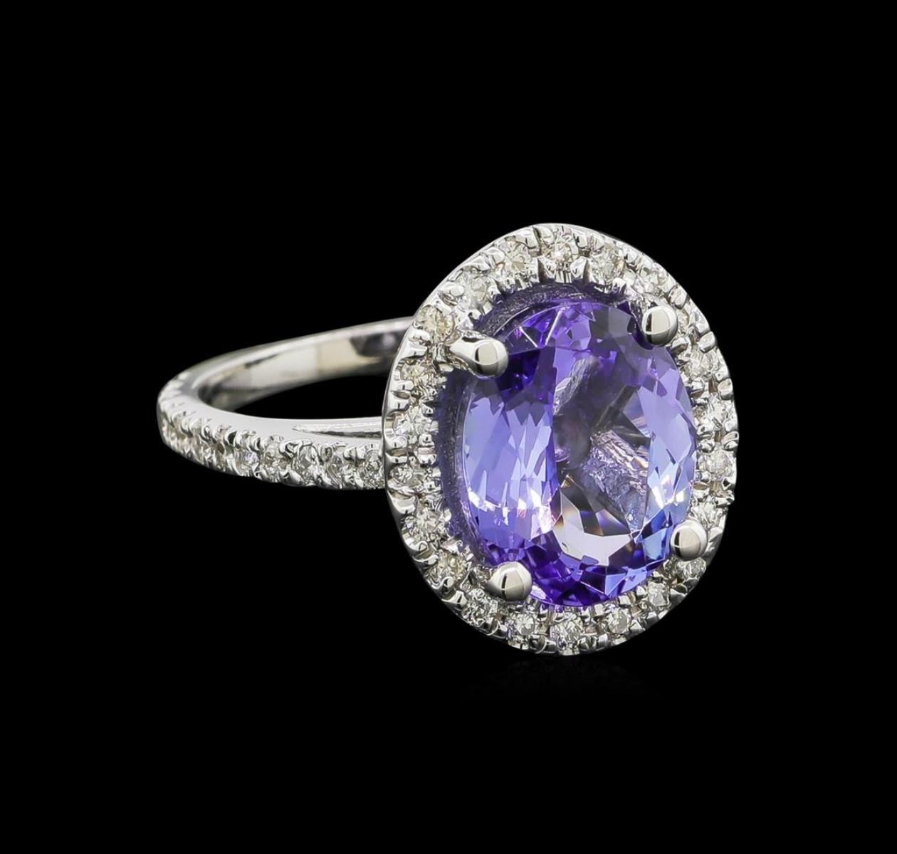 One electronically tested 14KT white gold lady's cast fashion ring with a halo with a bright polish finish. The featured lady's ring has a shank measuring 1.80 millimeters wide. Identified with markings of '14K'. Condition is new, good workmanship. Containing: One prong set oval modified brilliant cut natural tanzanite, measuring 11.36 x 9.34 x 5.60mm, (depth est.) 10%. bulge factor, approximate weight of 4.60ct., clarity is eye clean, medium, moderately strong, bluish violet color, (GIA bV 5/4), cut is very good. Transmitting light with no distortion, transparent. Colored gemstones are presumed to have been subjected to commonly used enhancement processes. Graded in the setting. Forty-Six prong set round brilliant cut diamonds, measuring 1.50 - 1.45 x 0.92mm (depth est.) approximate total weight of 46 Stones = 0.56ct. Graded in the setting. Clarity SI-1 to SI-2. Color: H - I Cut Good. Total Weight of Colored Stones 4.60ct.. Total Weight of Diamonds 0.56ct.. Total Weight of Ring 5.40gm GAS Appraised.