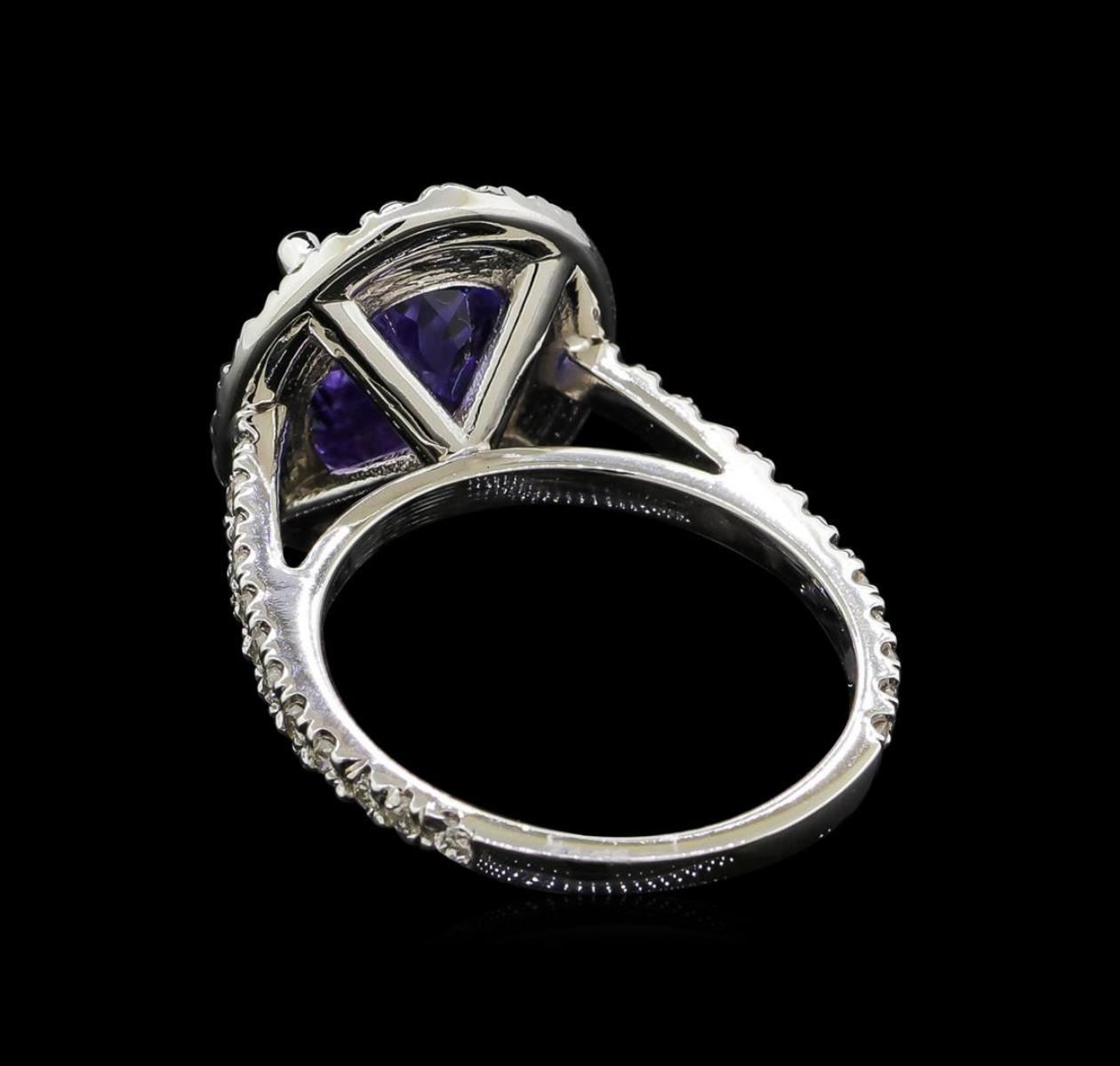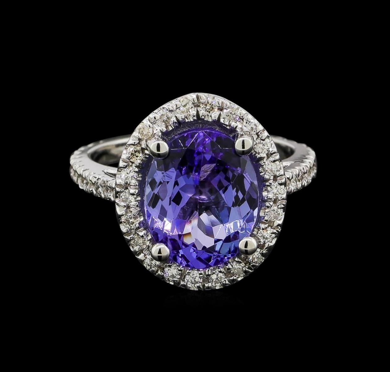 One electronically tested 14KT white gold lady's cast fashion ring with a halo with a bright polish finish. The featured lady's ring has a shank measuring 1.80 millimeters wide. Identified with markings of '14K'. Condition is new, good workmanship. Containing: One prong set oval modified brilliant cut natural tanzanite, measuring 11.36 x 9.34 x 5.60mm, (depth est.) 10%. bulge factor, approximate weight of 4.60 ct., clarity is eye clean, medium, moderately strong, bluish violet color, (GIA bV 5/4), cut is very good. Transmitting light with no distortion, transparent. Colored gemstones are presumed to have been subjected to commonly used enhancement processes. Graded in the setting. Forty-Six prong set round brilliant cut diamonds, measuring 1.50 - 1.45 x 0.92mm (depth est.) approximate total weight of 46 Stones = 0.56ct. Graded in the setting. Clarity SI-1 to SI-2. Color: H - I Cut Good. Total Weight of Colored Stones 4.60 ct.. Total Weight of Diamonds 0.56ct.. Total Weight of Ring 5.40gm GAS Appraised.