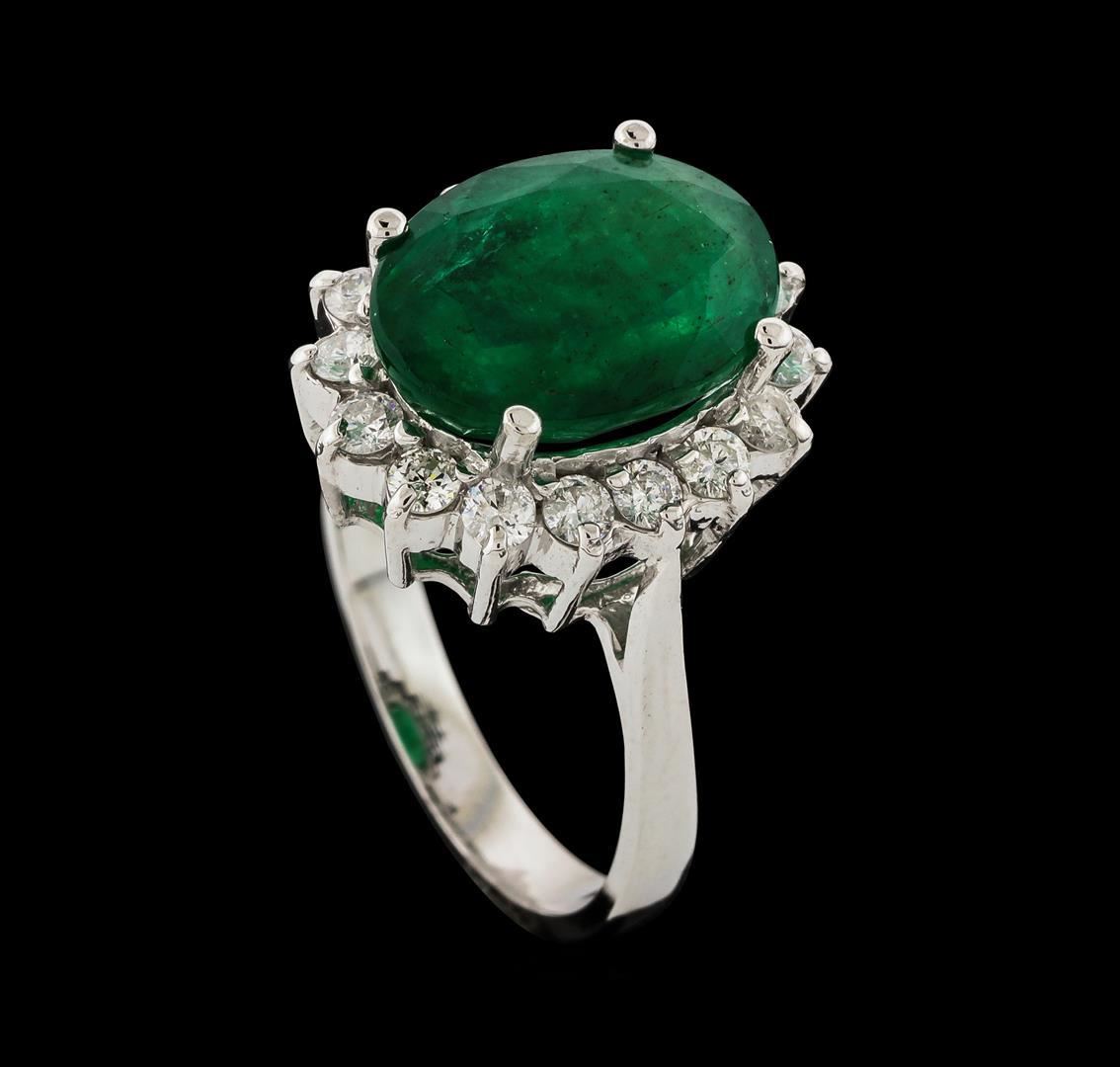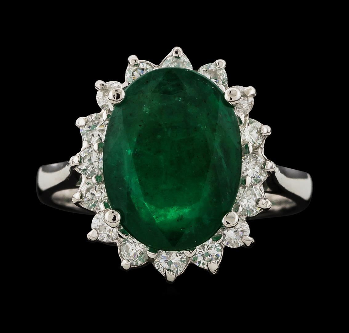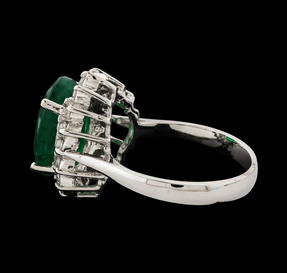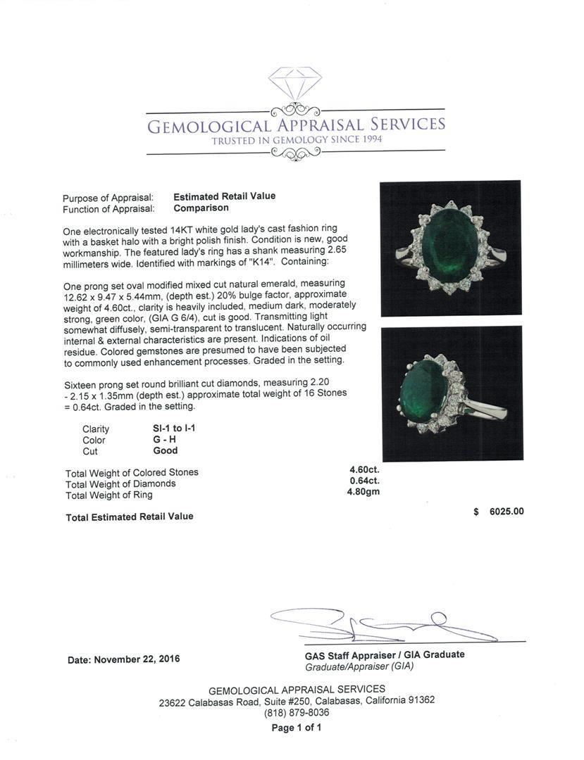 One electronically tested 14KT white gold lady's cast fashion ring with a basket halo with a bright polish finish. The featured lady's ring has a shank measuring 2.65 millimeters wide. Identified with markings of 'K14'. Condition is new, good workmanship. Containing: One prong set oval modified mixed cut natural emerald, measuring 12.62 x 9.47 x 5.44mm, (depth est.) 20%. bulge factor, approximate weight of 4.60ct., clarity is heavily included, medium dark, moderately strong, green color, (GIA G 6/4), cut is good. Transmitting light somewhat diffusely, semi-transparent to translucent. Naturally occurring internal & external characteristics are present. Indications of oil residue. Colored gemstones are presumed to have been subjected to commonly used enhancement processes. Graded in the setting. Sixteen prong set round brilliant cut diamonds, measuring 2.20 - 2.15 x 1.35mm (depth est.) approximate total weight of 16 Stones = 0.64ct. Graded in the setting. Clarity SI-1 to I-1. Color: G - H Cut Good. Total Weight of Colored Stones 4.60ct.. Total Weight of Diamonds 0.64ct.. Total Weight of Ring 4.80gm. GAS Appraised.