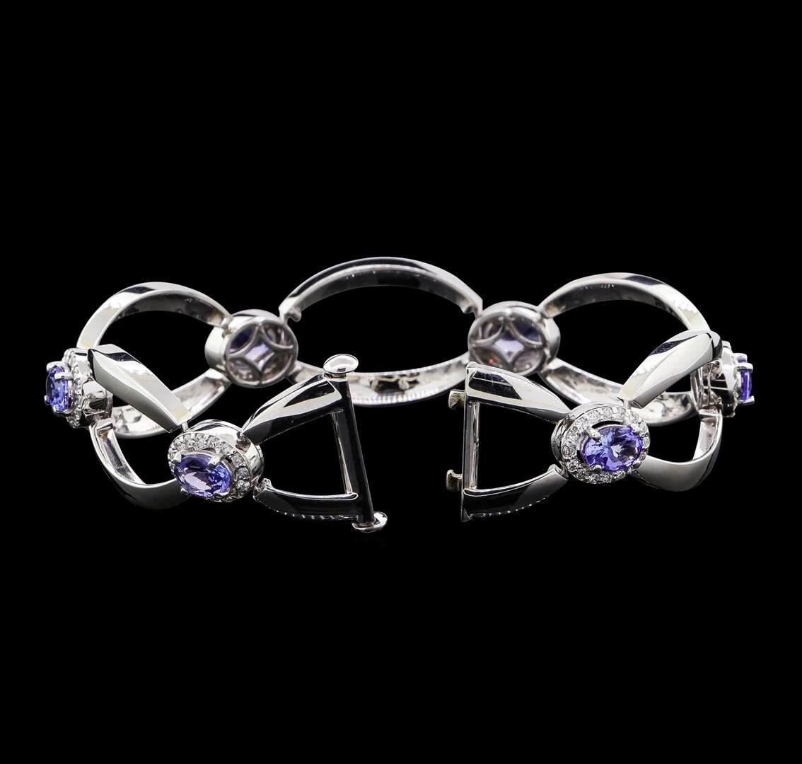 One electronically tested 14KT white gold lady's combination cast & assembled fashion bracelet with a double plunger clasp with a bright polish finish. The featured lady's bracelet has six oval tanzanites, each surrounded by a halo and connected by opposing crescent shaped bars. The bracelet measures approximately 7 inches in length. Identified with markings of 'K14'. Condition is new, good workmanship. Containing: Six prong set oval modified brilliant cut natural tanzanites, measuring 7.05 x 5.10 x 3.20mm, (depth est.) approximate total weight of 4.60ct., clarity is eye clean, medium light, very slightly grayish, violet color, (GIA V 4/3), cut is good. Transmitting light with no distortion, transparent. Colored gemstones are presumed to have been subjected to commonly used enhancement processes. Graded in the setting. Ninety-Six prong set round brilliant cut diamonds, measuring 1.40 - 1.35 x 0.86mm (depth est.) approximate total weight of 96 Stones = 0.96ct. Graded in the setting. Clarity SI-1 to SI-2. Color: H - I Cut Good. Total Weight of Colored Stones 4.60ct.. Total Weight of Diamonds 0.96ct.. Total Weight of Bracelet 25.20gm. GAS Appraised at $9,075.00.