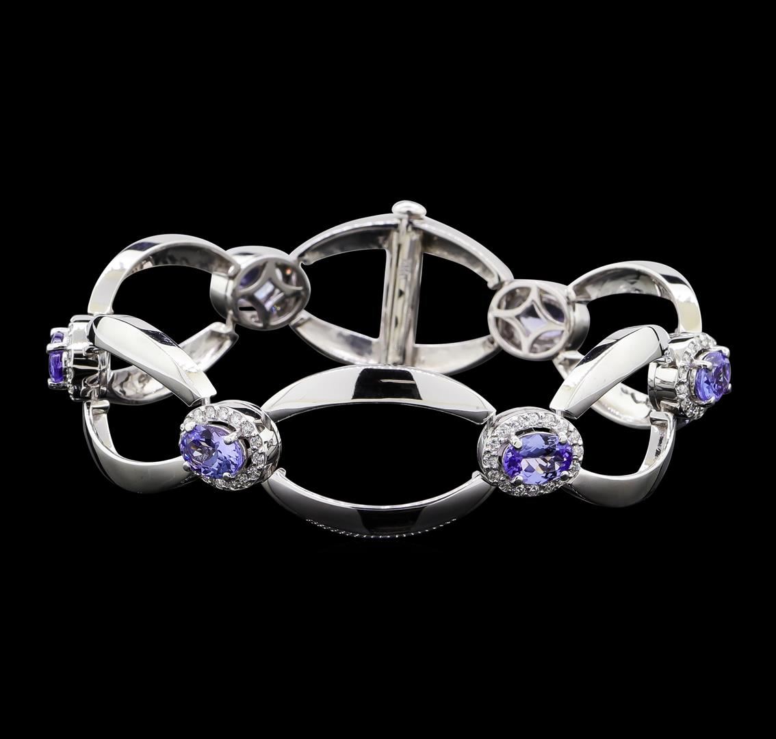 One electronically tested 14KT white gold lady's combination cast & assembled fashion bracelet with a double plunger clasp with a bright polish finish. The featured lady's bracelet has six oval tanzanites, each surrounded by a halo and connected by opposing crescent shaped bars. The bracelet measures approximately 7 inches in length. Identified with markings of 'K14'. Condition is new, good workmanship. Containing: Six prong set oval modified brilliant cut natural tanzanites, measuring 7.05 x 5.10 x 3.20mm, (depth est.) approximate total weight of 4.60ct., clarity is eye clean, medium light, very slightly grayish, violet color, (GIA V 4/3), cut is good. Transmitting light with no distortion, transparent. Colored gemstones are presumed to have been subjected to commonly used enhancement processes. Graded in the setting. Ninety-Six prong set round brilliant cut diamonds, measuring 1.40 - 1.35 x 0.86mm (depth est.) approximate total weight of 96 Stones = 0.96ct. Graded in the setting. Clarity SI-1 to SI-2. Color: H - I Cut Good. Total Weight of Colored Stones 4.60ct.. Total Weight of Diamonds 0.96ct.. Total Weight of Bracelet 25.20gm. GAS Appraised at $9,075.00.