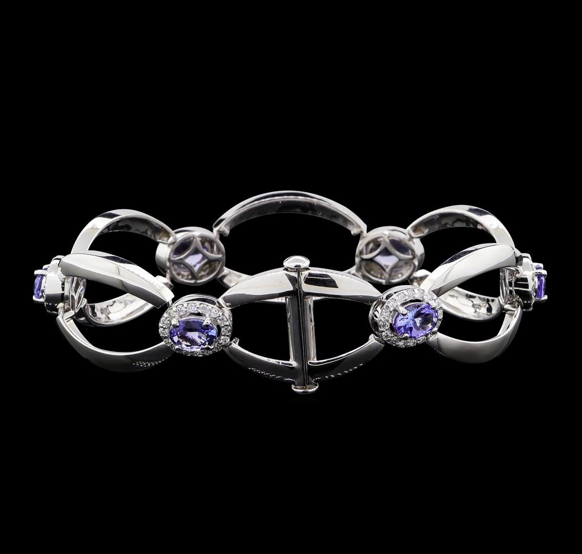 One electronically tested 14KT white gold lady's combination cast & assembled fashion bracelet with a double plunger clasp with a bright polish finish. The featured lady's bracelet has six oval tanzanites, each surrounded by a halo and connected by opposing crescent shaped bars. The bracelet measures approximately 7 inches in length. Identified with markings of 'K14'. Condition is new, good workmanship. Containing: Six prong set oval modified brilliant cut natural tanzanites, measuring 7.05 x 5.10 x 3.20mm, (depth est.) approximate total weight of 4.60ct., clarity is eye clean, medium light, very slightly grayish, violet color, (GIA V 4/3), cut is good. Transmitting light with no distortion, transparent. Colored gemstones are presumed to have been subjected to commonly used enhancement processes. Graded in the setting. Ninety-Six prong set round brilliant cut diamonds, measuring 1.40 - 1.35 x 0.86mm (depth est.) approximate total weight of 96 Stones = 0.96ct. Graded in the setting. Clarity SI-1 to SI-2. Color: H - I Cut Good. Total Weight of Colored Stones 4.60ct.. Total Weight of Diamonds 0.96ct.. Total Weight of Bracelet 25.20gm. GAS Appraised at $9,075.00.