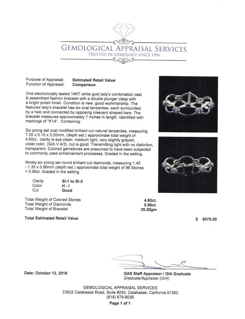 One electronically tested 14KT white gold lady's combination cast & assembled fashion bracelet with a double plunger clasp with a bright polish finish. The featured lady's bracelet has six oval tanzanites, each surrounded by a halo and connected by opposing crescent shaped bars. The bracelet measures approximately 7 inches in length. Identified with markings of 'K14'. Condition is new, good workmanship. Containing: Six prong set oval modified brilliant cut natural tanzanites, measuring 7.05 x 5.10 x 3.20mm, (depth est.) approximate total weight of 4.60ct., clarity is eye clean, medium light, very slightly grayish, violet color, (GIA V 4/3), cut is good. Transmitting light with no distortion, transparent. Colored gemstones are presumed to have been subjected to commonly used enhancement processes. Graded in the setting. Ninety-Six prong set round brilliant cut diamonds, measuring 1.40 - 1.35 x 0.86mm (depth est.) approximate total weight of 96 Stones = 0.96ct. Graded in the setting. Clarity SI-1 to SI-2. Color: H - I Cut Good. Total Weight of Colored Stones 4.60ct.. Total Weight of Diamonds 0.96ct.. Total Weight of Bracelet 25.20gm. GAS Appraised at $9,075.00.