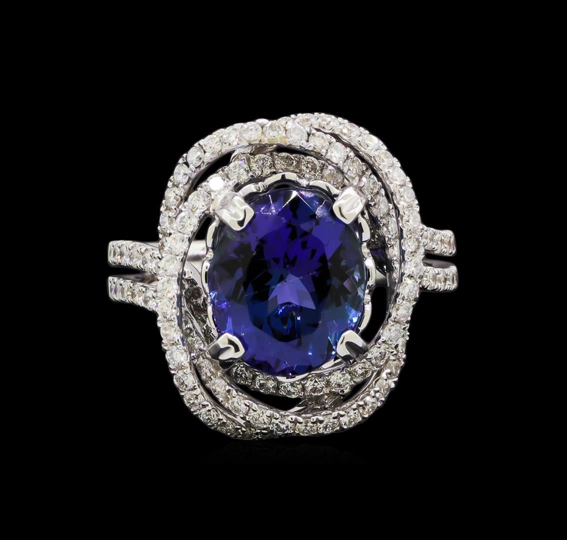 One electronically tested 18KT white gold lady's cast fashion Swirled Double Halo with a bypass halo with a bright polish finish. The featured lady's ring has a shank measuring 3.13 millimeters in width. Identified with markings of "18K". Condition is new, good workmanship. Containing: One prong set oval modified brilliant cut natural tanzanite, measuring 10.90 x 9.00 x 6.62mm, (depth est.) approximate weight of 4.60ct., clarity is eye clean, medium dark, very slightly grayish, bluish violet color, (GIA bV 6/3), cut is very good. Transmitting light with no distortion, transparent. Colored gemstones are presumed to have been subjected to commonly used enhancement processes. Graded in the setting. One Hundred Twelve prong set round brilliant cut diamonds, measuring 1.40 - 1.30 x 0.84mm (depth est.) approximate total weight of 112 Stones = 1.04ct. Graded in the setting. Clarity: SI-1 to I-1. Color: G - Good. Total Weight of Colored Stones 4.60ct. Total Weight of Diamonds 1.04ct. Total Weight of Swirled Double Halo 6.70gm. GAS Appraised at $11,680.00.