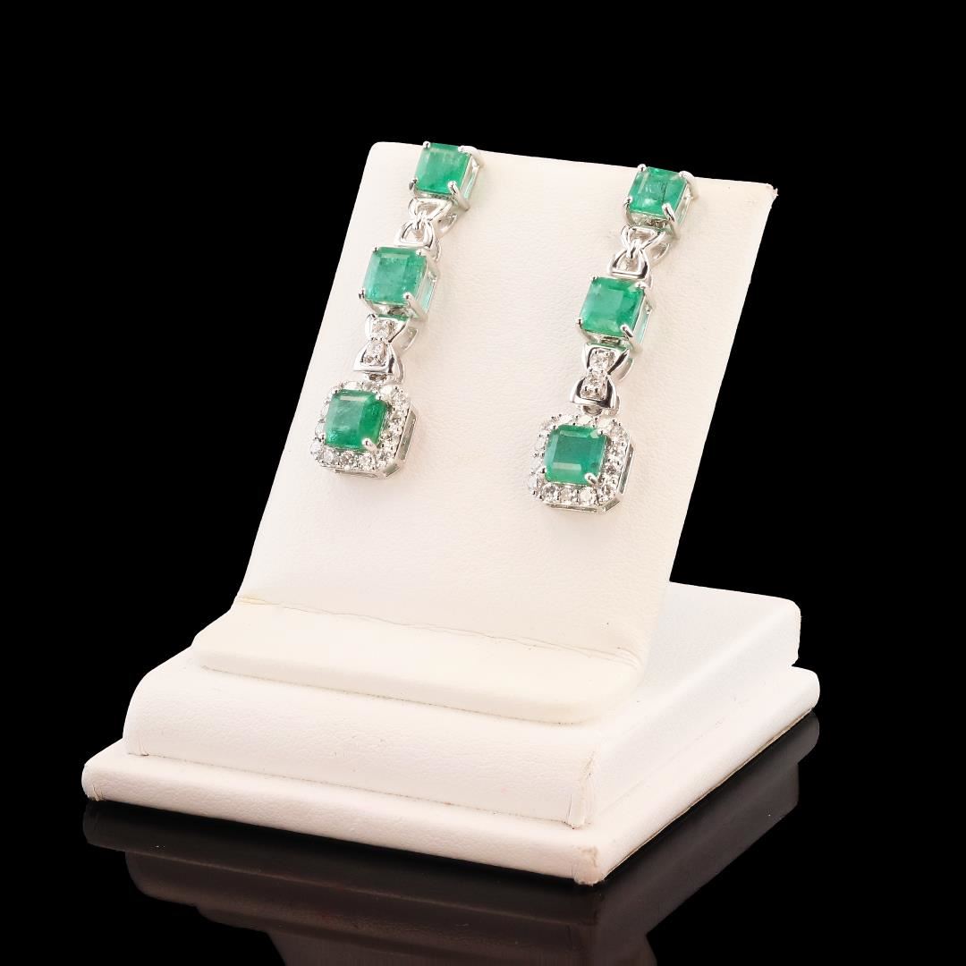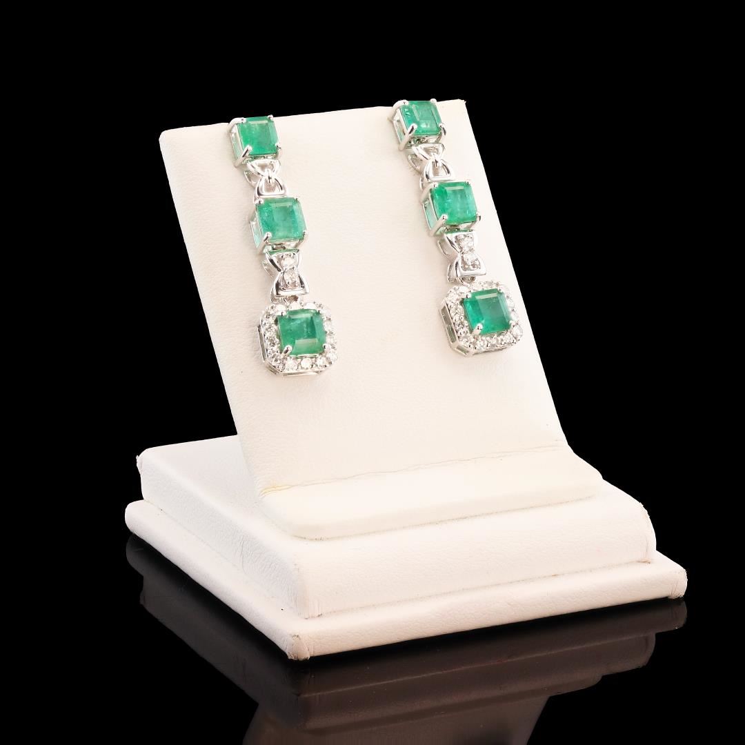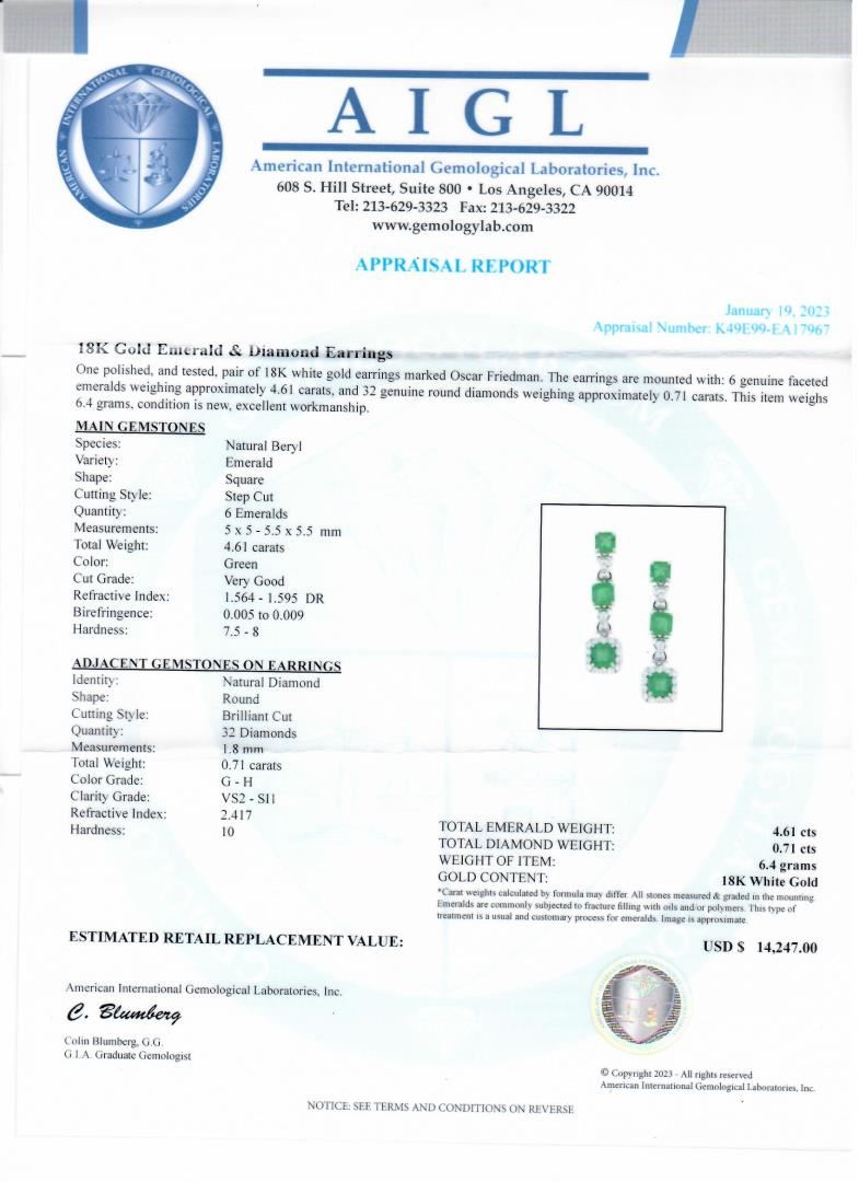 One polished, and tested, pair of 18K white gold earrings marked Oscar Friedman. The carrings are mounted with: 6 genuine faceted emeralds weighing approximately 4.61 carats, and 32 genuine round diamonds weighing approximately 0.71 carat, This tem weighs