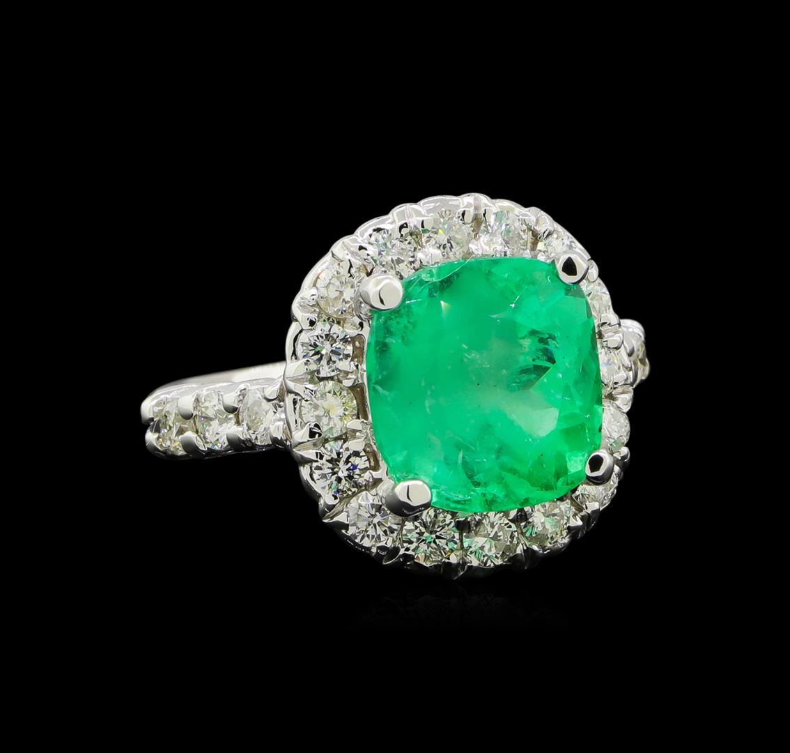 One electronically tested 14KT white gold lady's cast fashion ring with a basket halo with a bright polish finish. The featured lady's ring has a shank measuring 2.43 millimeters wide. Identified with markings of '14K'. Condition is new, good workmanship. Containing: One prong set square cushion modified brilliant cut natural emerald, measuring 10.28 x 9.97 x 8.02mm, (depth est.) approximate weight of 4.61ct., clarity is heavily included, medium, moderately strong, green color, (GIA G 5/4), cut is good. Transmitting light somewhat diffusely, semi-transparent to translucent. Indications of oil residue. Naturally occurring internal & external characteristics are present. Colored gemstones are presumed to have been subjected to commonly used enhancement processes. Graded in the setting. Twenty-Two prong set round brilliant cut diamonds, measuring 2.40 - 2.30 x 1.41mm (depth est.) approximate total weight of 22 Stones = 1.05ct. Graded in the setting. Clarity SI-1 to SI-2. Color: H - I Cut Good. Total Weight of Colored Stones 4.61ct.. Total Weight of Diamonds 1.05ct.. Total Weight of Ring 7.80gm. GAS Appraised at $8,350.00.