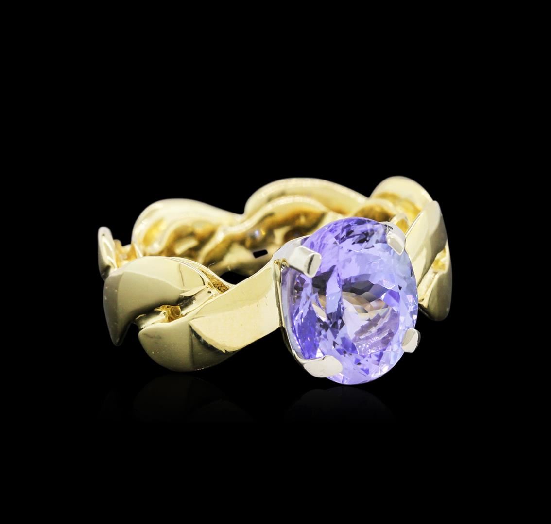 One electronically tested 18KT yellow and white gold lady's combination cast & assembled fashion ring with a "S" link shank with a bright polish finish. The featured lady's ring has a shank measuring 7.80 millimeters wide. Identified with markings of "750". Condition is used, good workmanship. Containing: One prong set oval modified brilliant cut natural tanzanite, measuring 11.11 x 8.98 x 6.88mm, approximate weight of 4.61ct., clarity is eye clean, type I, medium light, very slightly grayish, bluish violet color, (GIA bV 4/3), cut is very good. Transmitting light with no distortion, transparent. Colored gemstones are presumed to have been subjected to commonly used enhancement processes. Graded in the setting. Total Weight of Colored Stones 4.61ct. Total Weight of Ring 12.60gm. GAS Appraised at $6,090.00.