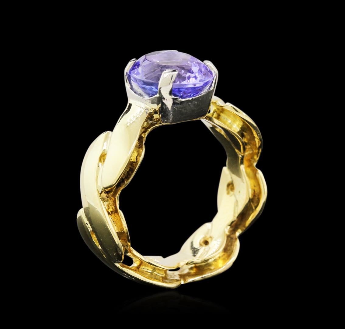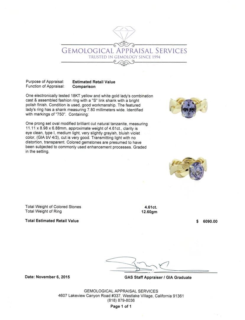 One electronically tested 18KT yellow and white gold lady's combination cast & assembled fashion ring with a "S" link shank with a bright polish finish. The featured lady's ring has a shank measuring 7.80 millimeters wide. Identified with markings of "750". Condition is used, good workmanship. Containing: One prong set oval modified brilliant cut natural tanzanite, measuring 11.11 x 8.98 x 6.88mm, approximate weight of 4.61ct., clarity is eye clean, type I, medium light, very slightly grayish, bluish violet color, (GIA bV 4/3), cut is very good. Transmitting light with no distortion, transparent. Colored gemstones are presumed to have been subjected to commonly used enhancement processes. Graded in the setting. Total Weight of Colored Stones 4.61ct. Total Weight of Ring 12.60gm. GAS Appraised at $6,090.00.