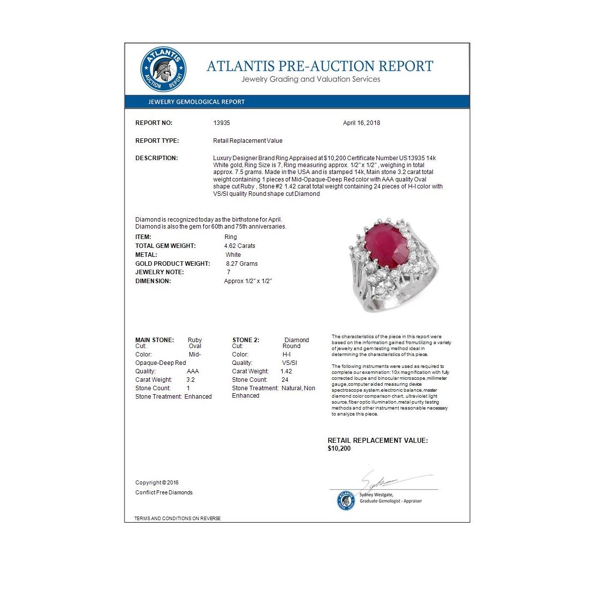 REF-132X5T -13935 ---- 4.62 CTW Ruby & Diamond Ring 14K White Gold ---- Luxury Designer Brand Ring Appraised at $10,200 Certificate Number US13935 14k White gold, Ring Size is 7, Ring measuring approx. 1/2" x 1/2" , weighing in total approx. 7.5 grams. Made in the USA and is stamped 14k, Main stone 3.2 carat total weight containing 1 pieces of Mid-Opaque-Deep Red color with AAA quality Oval shape cut Ruby , Stone #2 1.42 carat total weight containing 24 pieces of H-I color with VS/SI quality Round shape cut Diamond