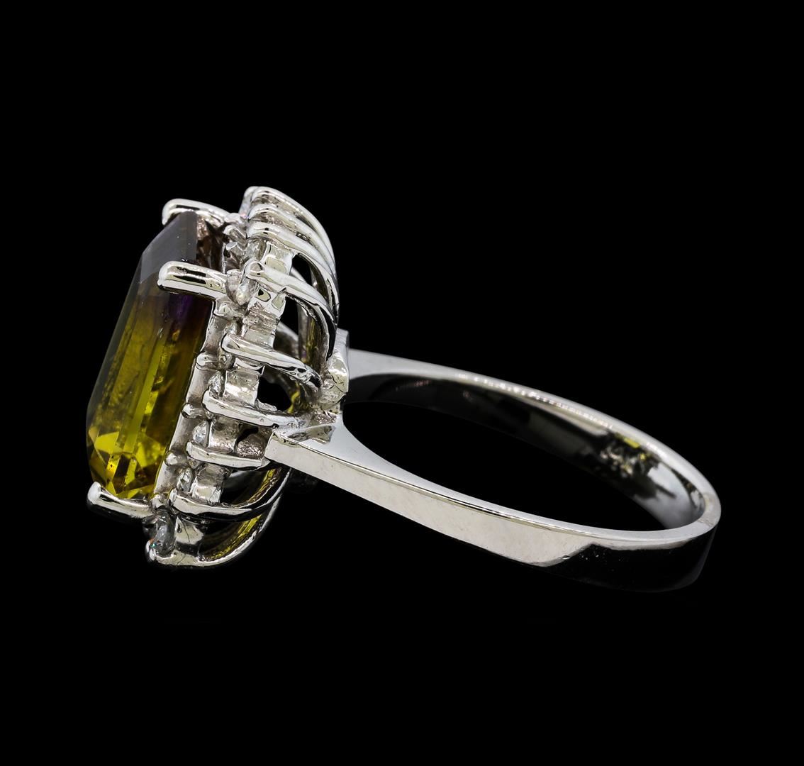 One Ametrine Quartz and Diamond Ring including: 14KT White Gold weighing a total of 5.50 grams, Ametrine Quartz weighing a total of 4.62ct and 18 Diamonds weighing a total of 0.65ctw.