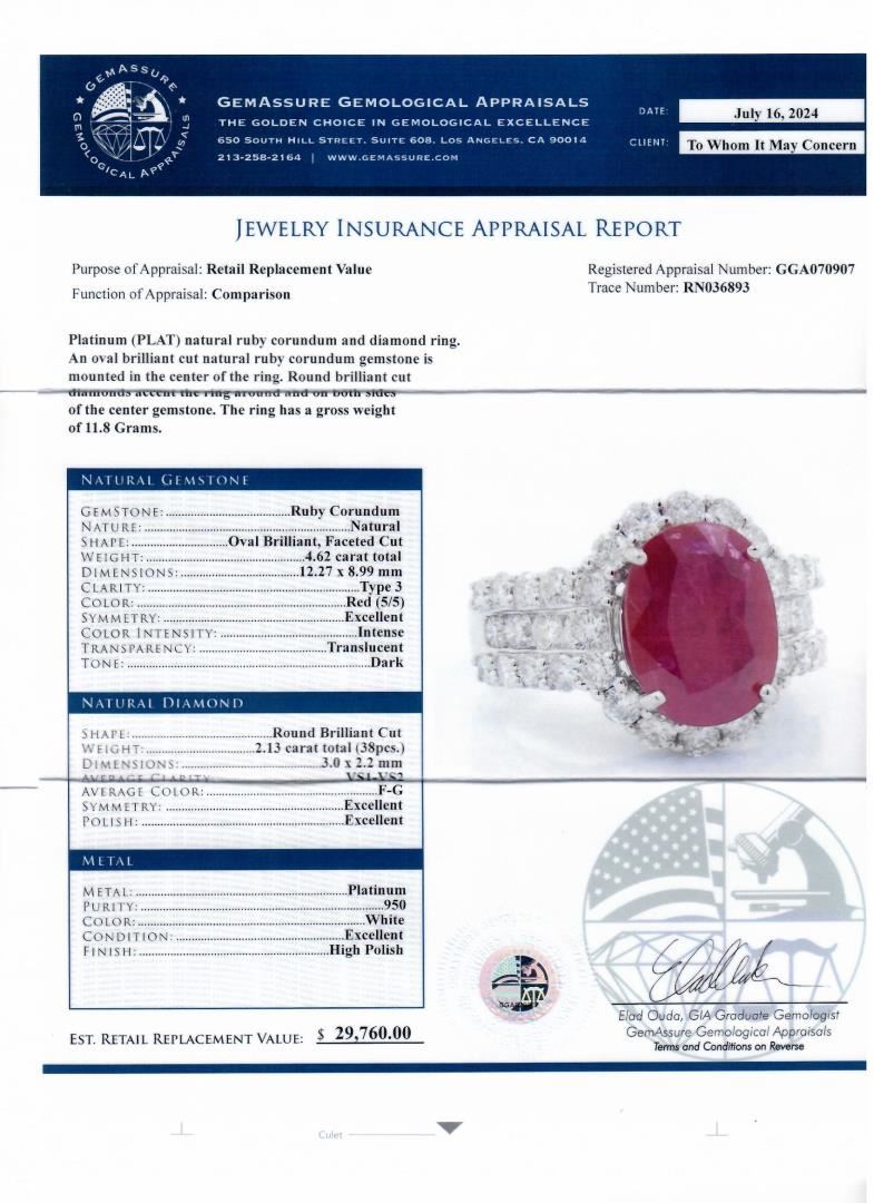 Platinum (PLAT) natural ruby corundum and diamond ring. An oval brilliant cut natural ruby corundum gemstone is mounted in the center of the ring. Round brilliant cut diamond accent the ring around and on both sides of the center gemstone. The ring has a gross weight of 11.8 Grams. #NATURAL GEMSTONE# GEMSTONE: Ruby Corundum NATURE: Natural SHAPE: Oval Brilliant, Faceted Cut WEIGHT: 4.62 carat total DIMENSIONS: 12.27 x 8.99mm CLARITY: Type 3 COLOR: Red (5/5) SYMMETRY: Excellent COLOR INTENSITY: Intense TRANSPARENCY: Translucent TONE: Dark #NATURAL DIAMOND# SHAPE: Round Brilliant Cut WEIGHT: 2.13 carat total (38pcs.) DIMENSIONS: 3.0 x 2.2mm AVERAGE CLARITY: VS1-VS2 AVERAGE COLOR: F-G SYMMETRY: Excellent POLISH: Excellent #METAL# METAL: Platinum PURITY: 950 COLOR: White CONDITION: Excellent FINISH: High Polish Size: 7