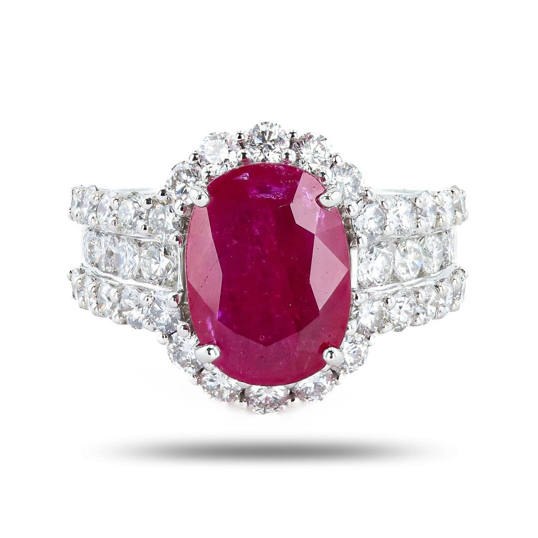 Platinum (PLAT) natural ruby corundum and diamond ring. An oval brilliant cut natural ruby corundum gemstone is mounted in the center of the ring. Round brilliant cut diamond accent the ring around and on both sides of the center gemstone. The ring has a gross weight of 11.8 Grams. #NATURAL GEMSTONE# GEMSTONE: Ruby Corundum NATURE: Natural SHAPE: Oval Brilliant, Faceted Cut WEIGHT: 4.62 carat total DIMENSIONS: 12.27 x 8.99mm CLARITY: Type 3 COLOR: Red (5/5) SYMMETRY: Excellent COLOR INTENSITY: Intense TRANSPARENCY: Translucent TONE: Dark #NATURAL DIAMOND# SHAPE: Round Brilliant Cut WEIGHT: 2.13 carat total (38pcs.) DIMENSIONS: 3.0 x 2.2mm AVERAGE CLARITY: VS1-VS2 AVERAGE COLOR: F-G SYMMETRY: Excellent POLISH: Excellent #METAL# METAL: Platinum PURITY: 950 COLOR: White CONDITION: Excellent FINISH: High Polish Size: 7
