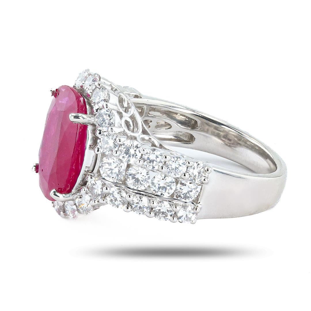 Platinum (PLAT) natural ruby corundum and diamond ring. An oval brilliant cut natural ruby corundum gemstone is mounted in the center of the ring. Round brilliant cut diamond accent the ring around and on both sides of the center gemstone. The ring has a gross weight of 11.8 Grams. #NATURAL GEMSTONE# GEMSTONE: Ruby Corundum; NATURE: Natural; SHAPE: Oval Brilliant, Faceted Cut; WEIGHT: 4.62 carat total; DIMENSIONS: 12.27 x 8.99mm; CLARITY: Type 3; COLOR: Red (5/5); SYMMETRY: Excellent; COLOR INTENSITY: Intense; TRANSPARENCY: Translucent; TONE: Dark #NATURAL DIAMOND# SHAPE: Round Brilliant Cut; WEIGHT: 2.13 carat total (38pcs.); DIMENSIONS: 3.0 x 2.2mm; AVERAGE CLARITY: VS1-VS2; AVERAGE COLOR: F-G; SYMMETRY: Excellent; POLISH: Excellent #METAL# METAL: Platinum; PURITY: 950; COLOR: White; CONDITION: Excellent; FINISH: High Polish #Size: 7