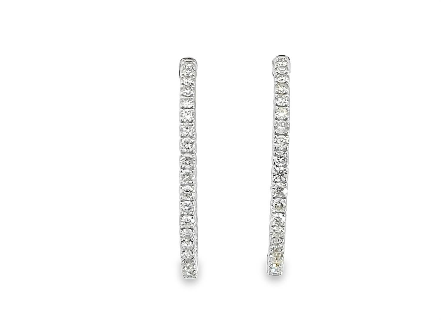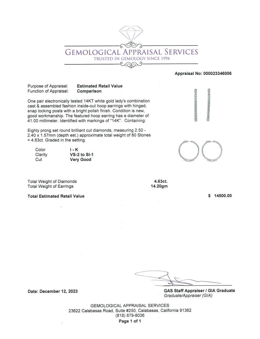 One pair electronically tested 14KT white gold lady's combination cast & assembled fashion inside-out hoop earrings with hinged, snap locking posts with a bright polish finish. The featured hoop earring has a diameter of 41.00 millimeter. Identified with markings of "14K". Condition is new, good workmanship. Containing: Eighty prong set round brilliant cut diamonds, measuring 2.50 - 2.40 x 1.57mm (depth est.) approximate total weight of 80 Stones = 4.63ct. Graded in the setting. Color I - K Clarity VS-2 to SI-1 Cut Very Good Total Weight of Diamonds 4.63ct. Total Weight of Earrings 14.20gm Estimated Retail Value $ 14500.00