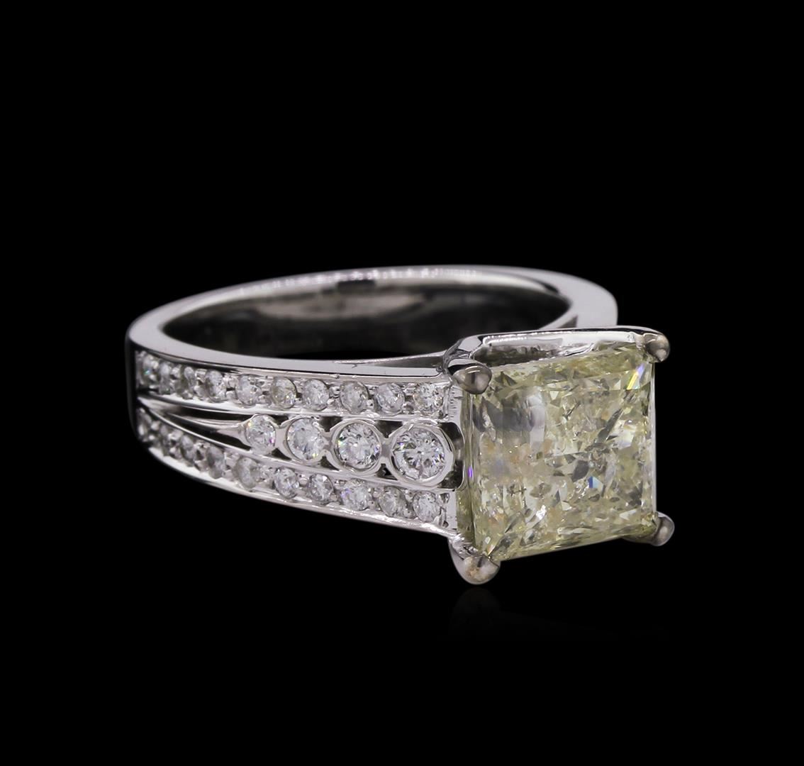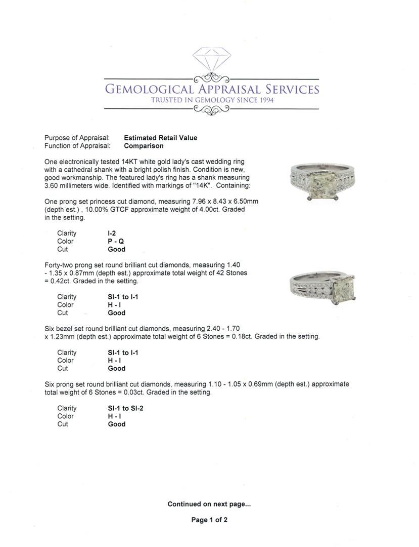 One electronically tested 14KT white gold lady's cast wedding ring with a cathedral shank with a bright polish finish. The featured lady's ring has a shank measuring 3.60 millimeters wide. Identified with markings of "14K". Condition is new, good workmanship. Containing: One prong set princess cut diamond, measuring 7.96 x 8.43 x 6.50mm (depth est.) , 10.00.%. GTCF approximate weight of 4.00ct. Graded in the setting. Clarity: I-2. Color: P - Q. Cut Good Forty-Two prong set round brilliant cut diamonds, measuring 1.40 - 1.35 x 0.87mm (depth est.) approximate total weight of 42 Stones = 0.42ct. Graded in the setting. Clarity: SI-1 to I-1. Color: H - I. Cut Good Six bezel set round brilliant cut diamonds, measuring 2.40 - 1.70 x 1.23mm (depth est.) approximate total weight of 6 Stones = 0.18ct. Graded in the setting. Clarity: SI-1 to I-1. Color: H - I. Cut Good Six prong set round brilliant cut diamonds, measuring 1.10 - 1.05 x 0.69mm (depth est.) approximate total weight of 6 Stones = 0.03ct. Graded in the setting. Clarity: SI-1 to SI-2. Color: H - I. Cut Good. Total Weight of Diamonds 4.63ct. Total Weight of Ring 7.40gm. GAS Appraised at $23,645.00.