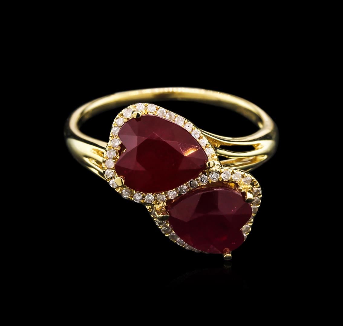 One polished, stamped, and tested 14K yellow gold ring mounted with: 2 genuine rubies weighing 4.63 carats, and 45 genuine round diamonds weighing 0.14 carats. This item weighs 4.4 grams, condition is new, excellent workmanship. Main Gemstone: Variety: Ruby. Species: Natural Corundum. Shape: Heart. Quantity: 2 Rubies. Cutting Style: Brilliant Cut Crown Step Cut Pavilion. Measurements: 8 x 7 mm. Total Weight: 4.63 carat. Color: Red. Cut Grade: Very Good. Refractive Index: 1.762 - 1.770 DR. Birefringence: 0.008 - 0.010. Hardness: 9. Adjacent Gemstones On Ring: Identity: Natural Diamond. Shape: Round. Cutting Style: Brilliant Cut. Quantity: 45 Diamonds. Measurements: 1.0 -1.2 mm. Total Weight: 0.14 carats. Clarity Grade: SI2-II. Color Grade: H- I. Refractive Index: 2.418. Hardness 10. Total Ruby Weight: 4.63cts. Total Diamond Weight: 0.14cts. Weight Of Item: 4.4 grams. Gold Content: 14K Yellow Gold. AIGL Appraised at $3,500.00.