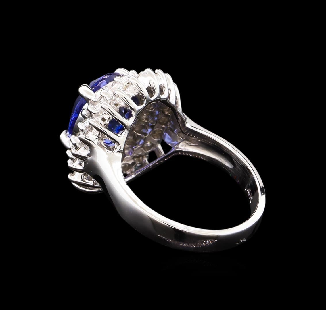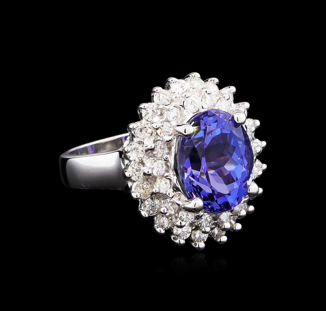 One electronically tested 14KT white gold lady's cast fashion ring with a double basket halo with a bright polish finish. The featured lady's ring has a shank measuring 3.06 millimeters wide. Identified with markings of "14K". Condition is new, good workmanship. Containing: One prong set oval modified brilliant cut natural tanzanite, measuring 10.79 x 8.78 x 6.85mm, approximate weight of 4.63ct., clarity is eye clean, type I, medium dark, very slightly grayish, bluish violet color, (GIA bV 6/3), cut is very good. Transmitting light with no distortion, transparent. Colored gemstones are presumed to have been subjected to commonly used enhancement processes. Graded in the setting. Twenty-Two prong set round brilliant cut diamonds, measuring 1.90 - 1.80 x 1.15mm (depth est.) approximate total weight of 22 Stones = 0.54ct. Graded in the setting. Clarity: SI-1 to SI-2. Color: H - I. Cut Good Eighteen prong set round brilliant cut diamonds, measuring 1.70 - 1.65 x 1.04mm (depth est.) approximate total weight of 18 Stones = 0.32ct. Graded in the setting. Clarity: SI-1 to SI-2. Color: H - I. Cut Good. Total Weight of Colored Stones 4.63ct. Total Weight of Diamonds 0.86ct. Total Weight of Ring 6.80gm. GAS Appraised at $10,380.00.