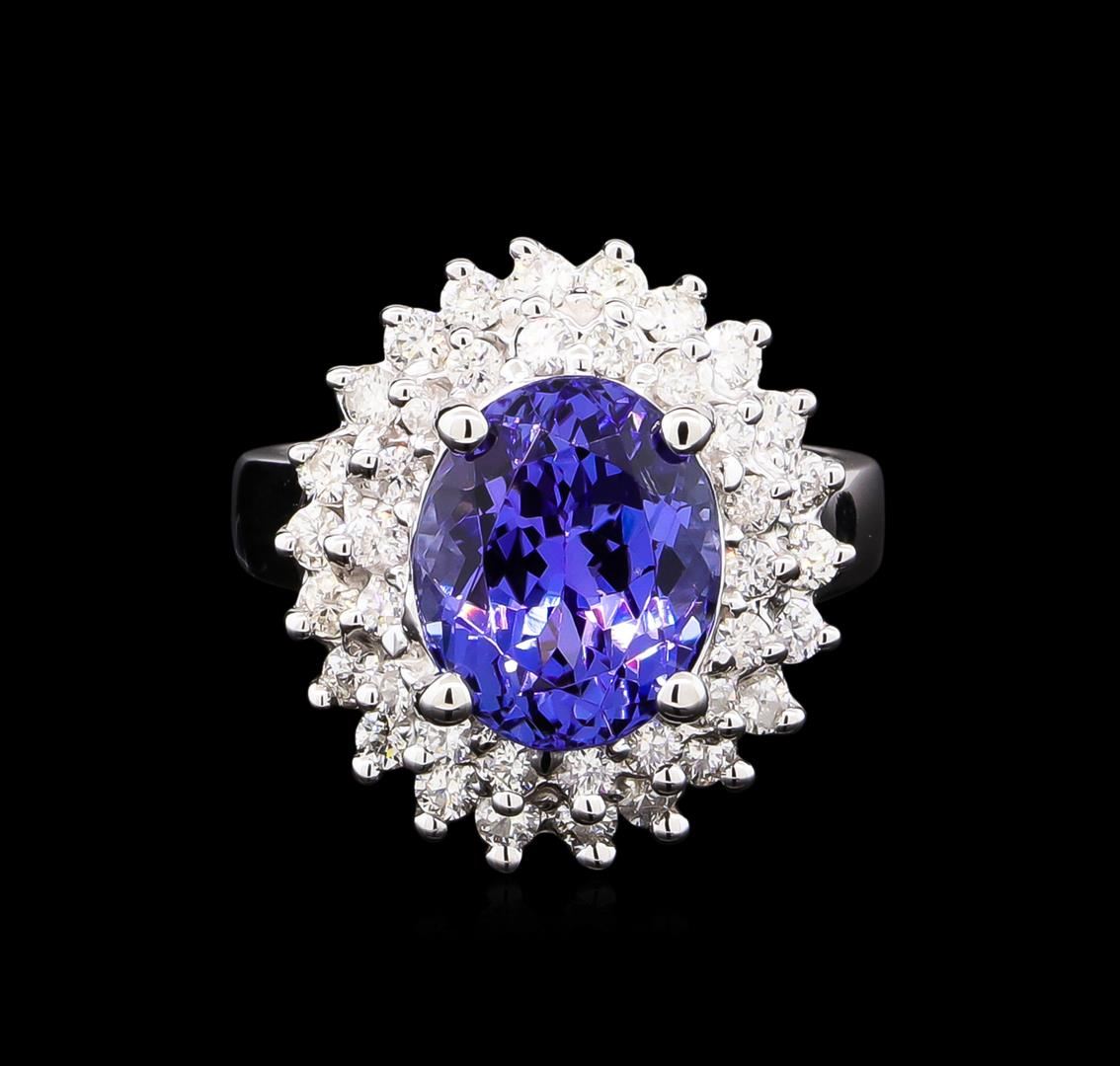 One electronically tested 14KT white gold lady's cast fashion ring with a double basket halo with a bright polish finish. The featured lady's ring has a shank measuring 3.06 millimeters wide. Identified with markings of "14K". Condition is new, good workmanship. Containing: One prong set oval modified brilliant cut natural tanzanite, measuring 10.79 x 8.78 x 6.85mm, approximate weight of 4.63ct., clarity is eye clean, type I, medium dark, very slightly grayish, bluish violet color, (GIA bV 6/3), cut is very good. Transmitting light with no distortion, transparent. Colored gemstones are presumed to have been subjected to commonly used enhancement processes. Graded in the setting. Twenty-Two prong set round brilliant cut diamonds, measuring 1.90 - 1.80 x 1.15mm (depth est.) approximate total weight of 22 Stones = 0.54ct. Graded in the setting. Clarity: SI-1 to SI-2. Color: H - I. Cut Good Eighteen prong set round brilliant cut diamonds, measuring 1.70 - 1.65 x 1.04mm (depth est.) approximate total weight of 18 Stones = 0.32ct. Graded in the setting. Clarity: SI-1 to SI-2. Color: H - I. Cut Good. Total Weight of Colored Stones 4.63ct. Total Weight of Diamonds 0.86ct. Total Weight of Ring 6.80gm. GAS Appraised at $10,380.00.