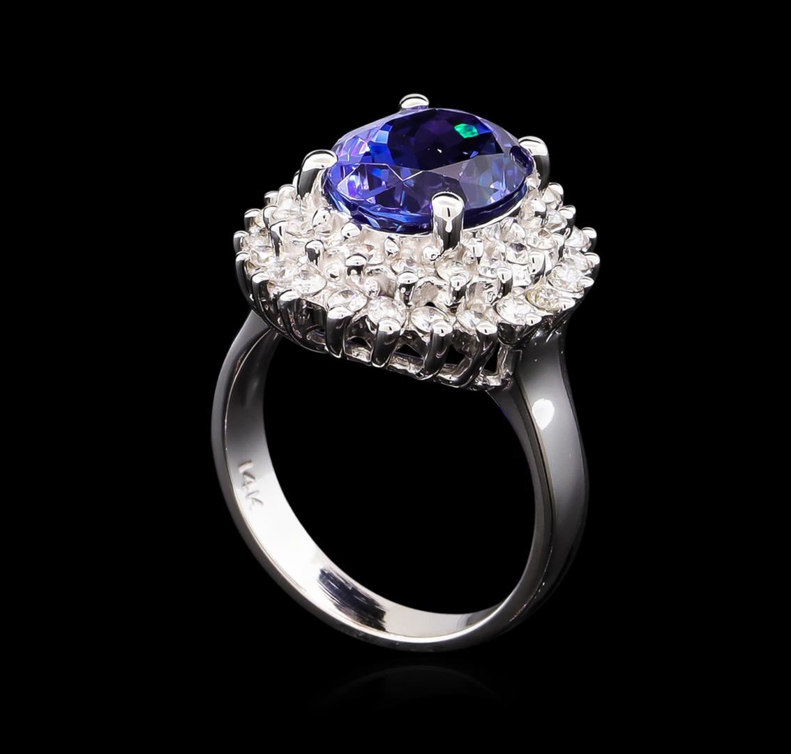 One electronically tested 14KT white gold lady's cast fashion ring with a double basket halo with a bright polish finish. The featured lady's ring has a shank measuring 3.06 millimeters wide. Identified with markings of "14K". Condition is new, good workmanship. Containing: One prong set oval modified brilliant cut natural tanzanite, measuring 10.79 x 8.78 x 6.85mm, approximate weight of 4.63ct., clarity is eye clean, type I, medium dark, very slightly grayish, bluish violet color, (GIA bV 6/3), cut is very good. Transmitting light with no distortion, transparent. Colored gemstones are presumed to have been subjected to commonly used enhancement processes. Graded in the setting. Twenty-Two prong set round brilliant cut diamonds, measuring 1.90 - 1.80 x 1.15mm (depth est.) approximate total weight of 22 Stones = 0.54ct. Graded in the setting. Clarity: SI-1 to SI-2. Color: H - I. Cut Good Eighteen prong set round brilliant cut diamonds, measuring 1.70 - 1.65 x 1.04mm (depth est.) approximate total weight of 18 Stones = 0.32ct. Graded in the setting. Clarity: SI-1 to SI-2. Color: H - I. Cut Good. Total Weight of Colored Stones 4.63ct. Total Weight of Diamonds 0.86ct. Total Weight of Ring 6.80gm. GAS Appraised at $10,380.00.